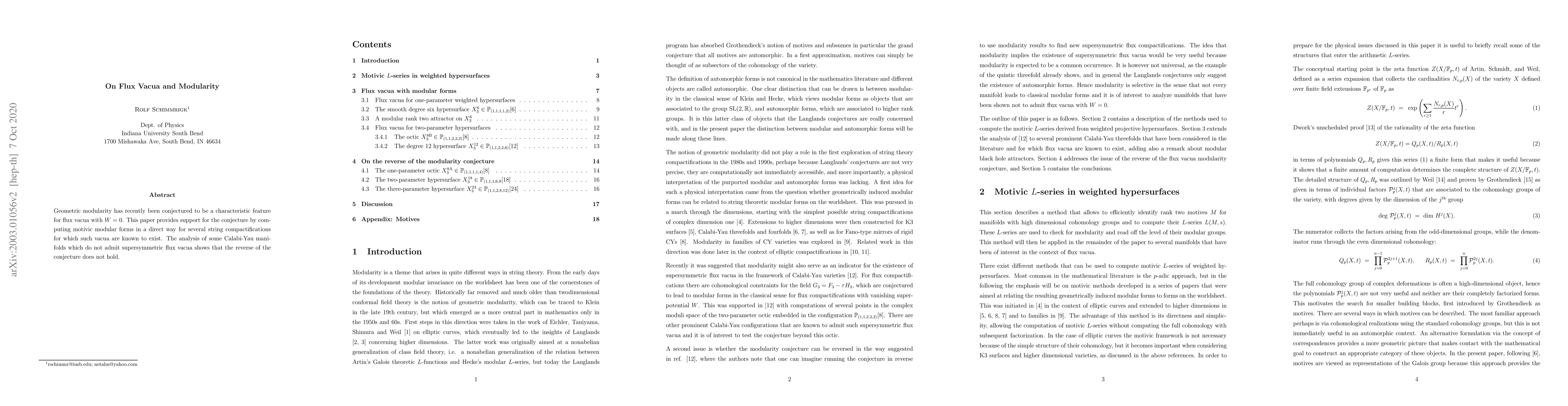 This paper supports the conjecture that geometric modularity is a feature of flux vacua with $W=0$ by directly computing motivic modular forms for known string compactifications. It also demonstrates that the reverse of this conjecture does not hold by analyzing Calabi-Yau manifolds without supersymmetric flux vacua.