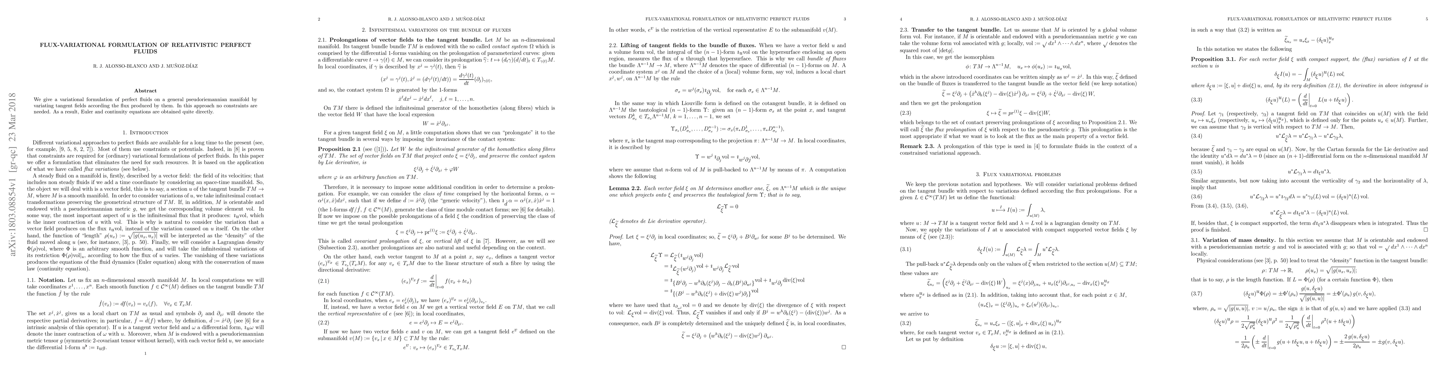 We give a variational formulation of perfect fluids on a general pseudoriemannian manifold by variating tangent fields according the flux produced by them. In this approach no constraints are needed. As a result, Euler and continuity equations are obtained quite directly.