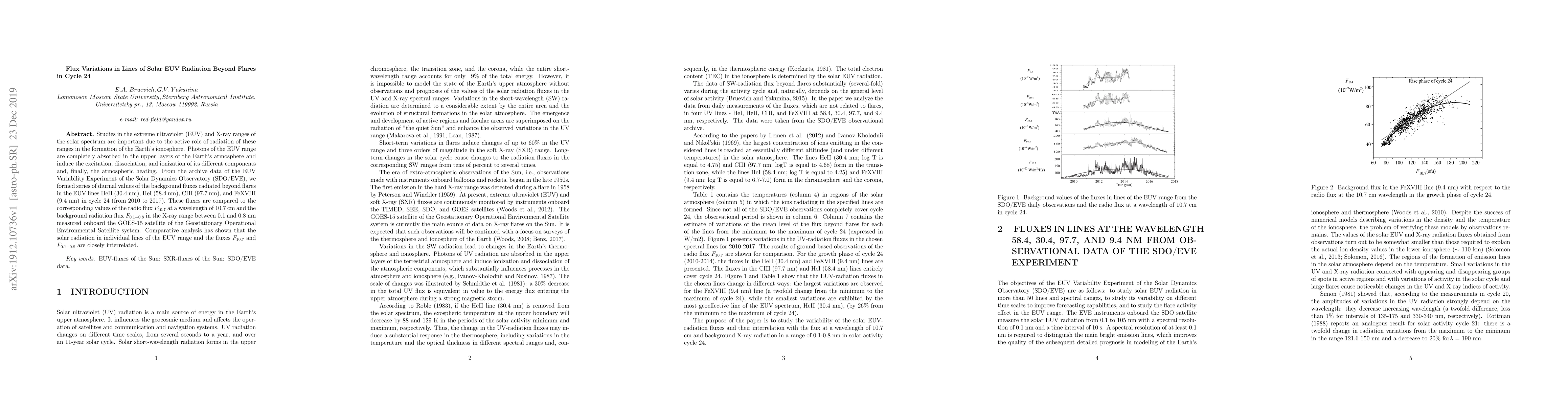 Studies in the extreme ultraviolet (EUV) and X-ray ranges of the solar spectrum are important due to the active role of radiation of these ranges in the formation of the Earth's ionosphere. Photons of the EUV range are completely absorbed in the upper layers of the Earth's atmosphere and induce the excitation, dissociation, and ionization of its different components and, finally, the atmospheric heating. From the archive data of the EUV Variability Experiment of the Solar Dynamics Observatory (SDO/EVE), we formed series of diurnal values of the background fluxes radiated beyond flares in the EUV lines HeII (30.4 nm), HeI (58.4 nm), CIII (97.7 nm), and FeXVIII (9.4 nm) in cycle 24 (from 2010 to 2017). These fluxes are compared to the corresponding values of the radio flux F10.7 at a wavelength of 10.7 cm and the background radiation flux F0.1-0.8 in the X-ray range between 0.1 and 0.8 nm measured onboard the GOES-15 satellite of the Geostationary Operational Environmental Satellite system. Comparative analysis has shown that the solar radiation in individual lines of the EUV range and the fluxes F10.7 and F0.1-0.8 are closely interrelated.