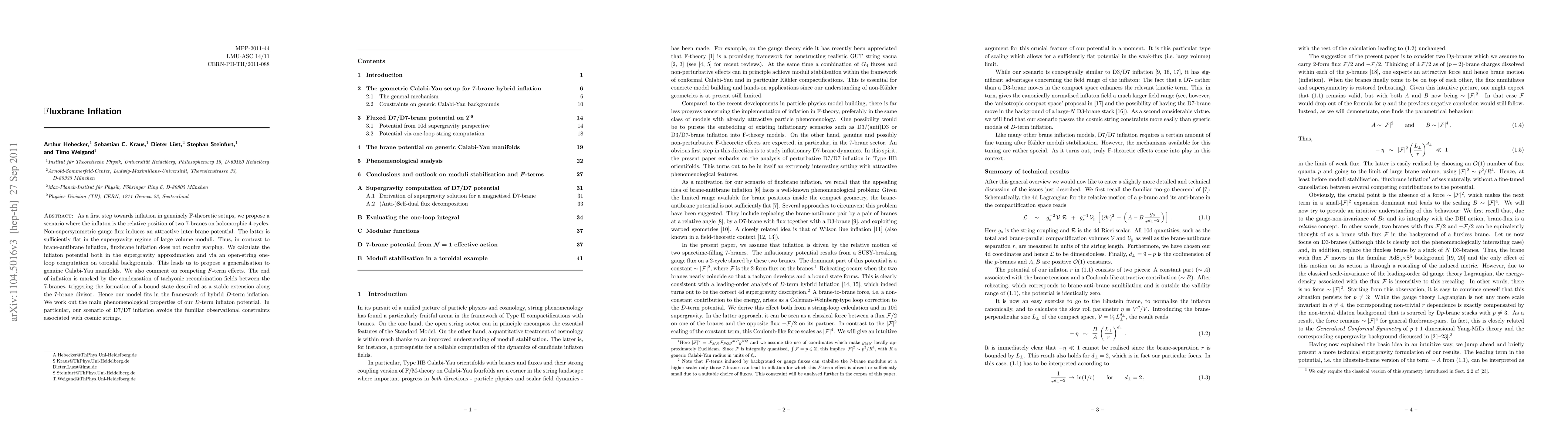 Fluxbrane inflation proposes an inflaton driven by the relative position of two 7-branes in F-theoretic setups, utilizing gauge flux to create a flat potential without requiring warping. The end of inflation is marked by tachyonic recombination fields forming stable bound states.