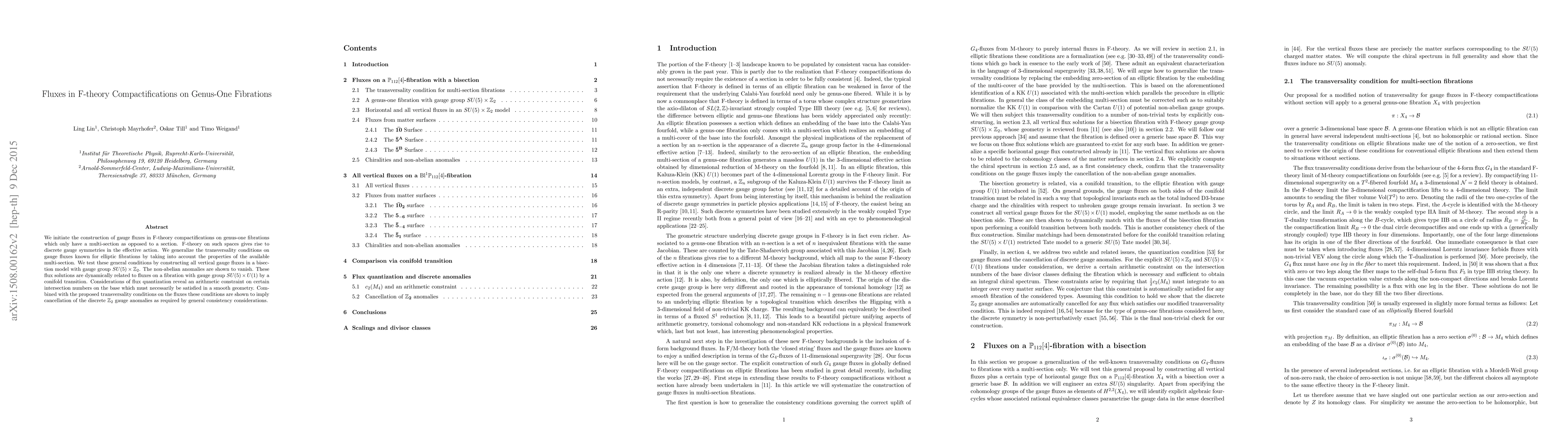 We initiate the construction of gauge fluxes in F-theory compactifications on genus-one fibrations which only have a multi-section as opposed to a section. F-theory on such spaces gives rise to discrete gauge symmetries in the effective action. We generalize the transversality conditions on gauge fluxes known for elliptic fibrations by taking into account the properties of the available multi-section. We test these general conditions by constructing all vertical gauge fluxes in a bisection model with gauge group SU(5) x Z2. The non-abelian anomalies are shown to vanish. These flux solutions are dynamically related to fluxes on a fibration with gauge group SU(5) x U(1) by a conifold transition. Considerations of flux quantization reveal an arithmetic constraint on certain intersection numbers on the base which must necessarily be satisfied in a smooth geometry. Combined with the proposed transversality conditions on the fluxes these conditions are shown to imply cancellation of the discrete Z2 gauge anomalies as required by general consistency considerations.