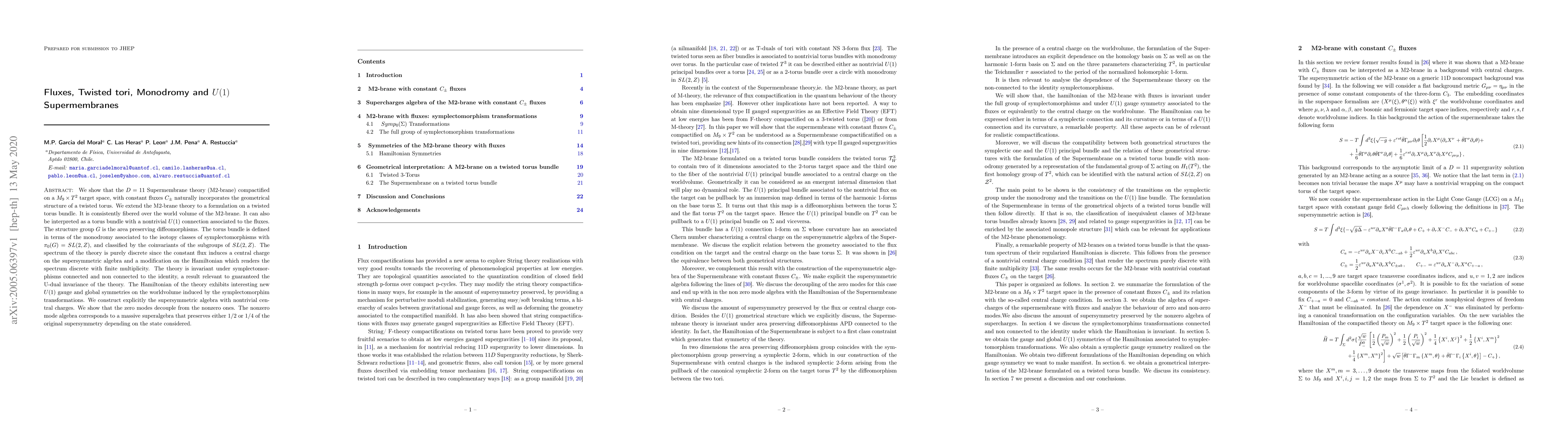 We show that the $D=11$ Supermembrane theory (M2-brane) compactified on a $M_9 \times T^2$ target space, with constant fluxes $C_{\pm}$ naturally incorporates the geometrical structure of a twisted torus. We extend the M2-brane theory to a formulation on a twisted torus bundle. It is consistently fibered over the world volume of the M2-brane. It can also be interpreted as a torus bundle with a nontrivial $U(1)$ connection associated to the fluxes. The structure group $G$ is the area preserving diffeomorphisms. The torus bundle is defined in terms of the monodromy associated to the isotopy classes of symplectomorphisms with $\pi_{0} (G) = SL(2,Z)$, and classified by the coinvariants of the subgroups of $SL(2,Z)$. The spectrum of the theory is purely discrete since the constant flux induces a central charge on the supersymmetric algebra and a modification on the Hamiltonian which renders the spectrum discrete with finite multiplicity. The theory is invariant under symplectomorphisms connected and non connected to the identity, a result relevant to guaranteed the U-dual invariance of the theory. The Hamiltonian of the theory exhibits interesting new $U(1)$ gauge and global symmetries on the worldvolume induced by the symplectomorphim transformations. We construct explicitly the supersymmetric algebra with nontrivial central charges. We show that the zero modes decouple from the nonzero ones. The nonzero mode algebra corresponds to a massive superalgebra that preserves either $1/2$ or $1/4$ of the original supersymmetry depending on the state considered.