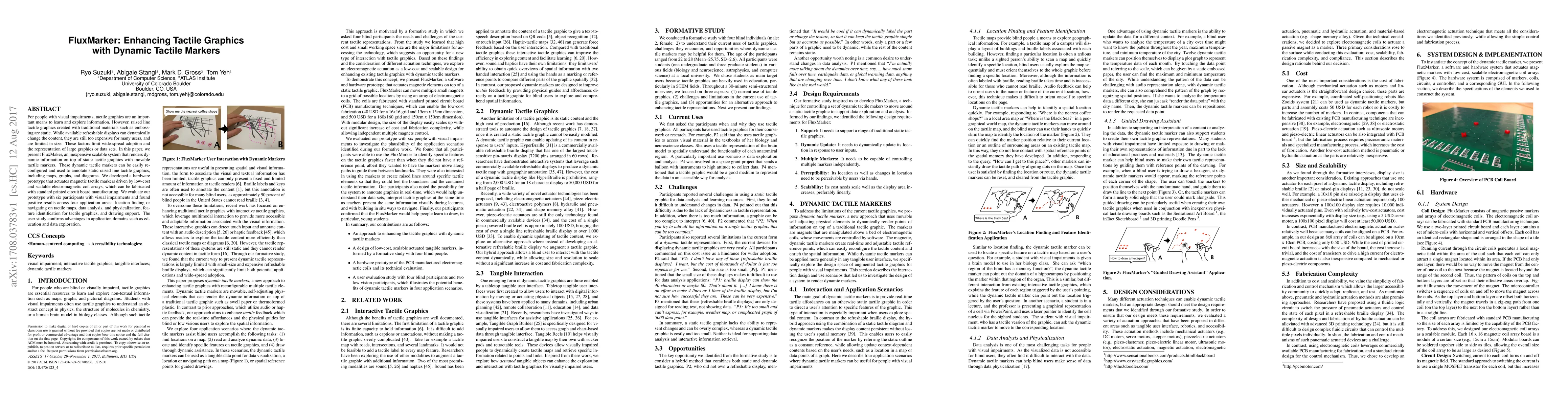 FluxMarker introduces an affordable, scalable system using dynamic tactile markers to enhance static tactile graphics, enabling users with visual impairments to navigate and analyze dynamic information on maps, graphs, and diagrams. The prototype employs low-cost electromagnetic coils to actuate magnetic markers, showing positive results in education and data exploration.