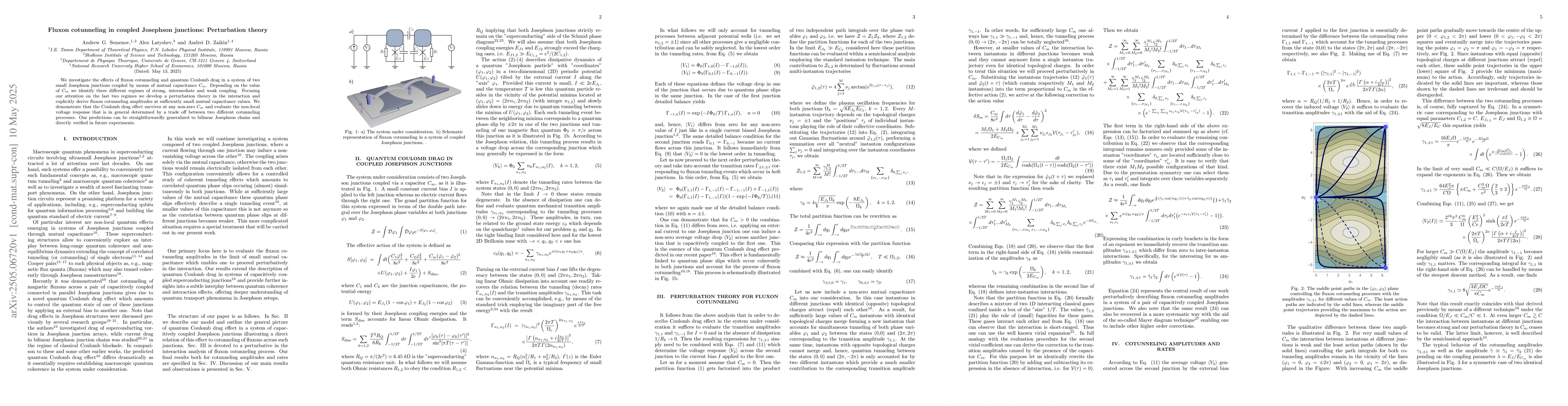 The research employs perturbation theory to investigate fluxon cotunneling and quantum Coulomb drag in a system of two coupled Josephson junctions via mutual capacitance $C_m$, identifying strong, intermediate, and weak coupling regimes.