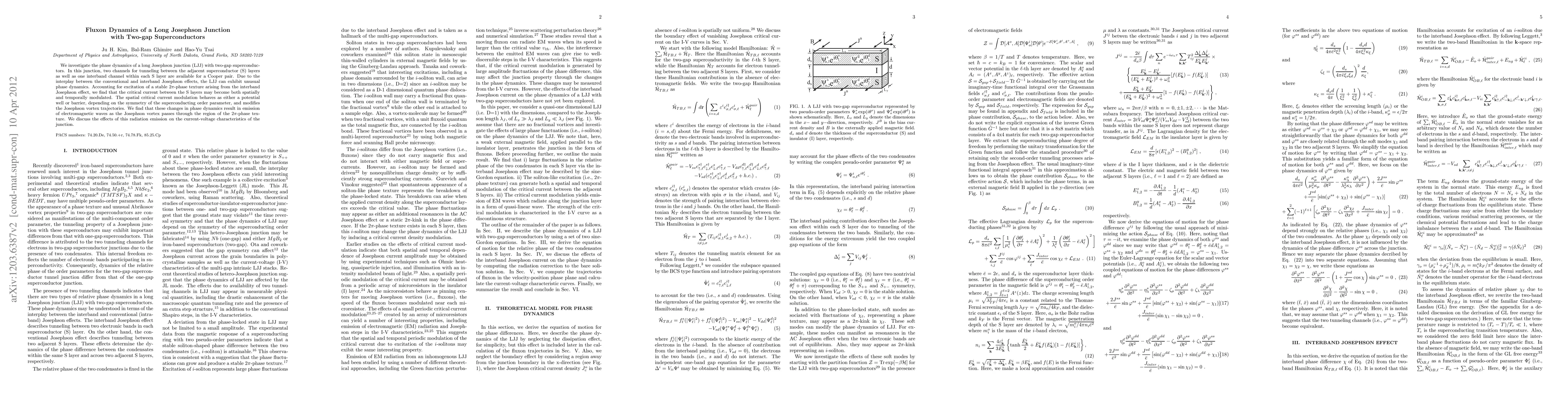 We investigate the phase dynamics of a long Josephson junction (LJJ) with two-gap superconductors. In this junction, two channels for tunneling between the adjacent superconductor (S) layers as well as one interband channel within each S layer are available for a Cooper pair. Due to the interplay between the conventional and interband Josephson effects, the LJJ can exhibit unusual phase dynamics. Accounting for excitation of a stable 2$\pi$-phase texture arising from the interband Josephson effect, we find that the critical current between the S layers may become both spatially and temporally modulated. The spatial critical current modulation behaves as either a potential well or barrier, depending on the symmetry of superconducting order parameter, and modifies the Josephson vortex trajectories. We find that these changes in phase dynamics result in emission of electromagnetic waves as the Josephson vortex passes through the region of the 2$\pi$-phase texture. We discuss the effects of this radiation emission on the current-voltage characteristics of the junction.