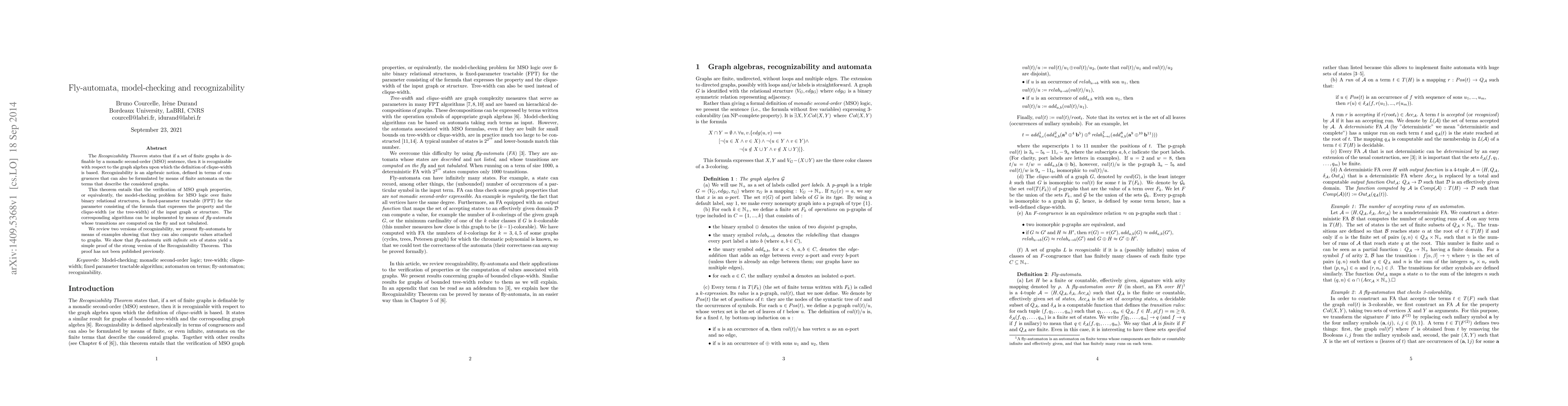 The Recognizability Theorem states that if a set of finite graphs is definable by a monadic second-order (MSO) sentence, then it is recognizable with respect to the graph algebra upon which the definition of clique-width is based. Recognizability is an algebraic notion, defined in terms of congruences that can also be formulated by means of finite automata on the terms that describe the considered graphs. This theorem entails that the verification of MSO graph properties, or equivalently, the model-checking problem for MSO logic over finite binary relational structures, is fixed-parameter tractable (FPT) for the parameter consisting of the formula that expresses the property and the clique-width (or the tree-width) of the input graph or structure. The corresponding algorithms can be implemented by means of fly-automata whose transitions are computed on the fly and not tabulated. We review two versions of recognizability, we present fly-automata by means of examples showing that they can also compute values attached to graphs. We show that fly-automata with infinite sets of states yield a simple proof of the strong version of the Recognizability Theorem. This proof has not been published previously.