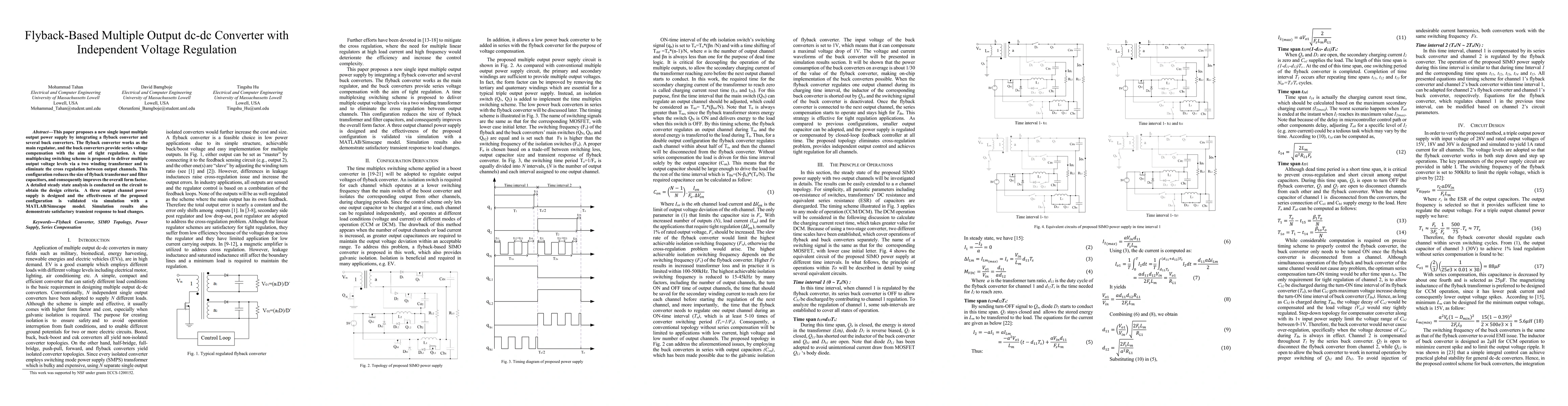 The paper presents a novel multiple output DC-DC converter topology that integrates a flyback converter with buck converters for series voltage compensation, employing a time multiplexing switching scheme to achieve independent output control and tight regulation.