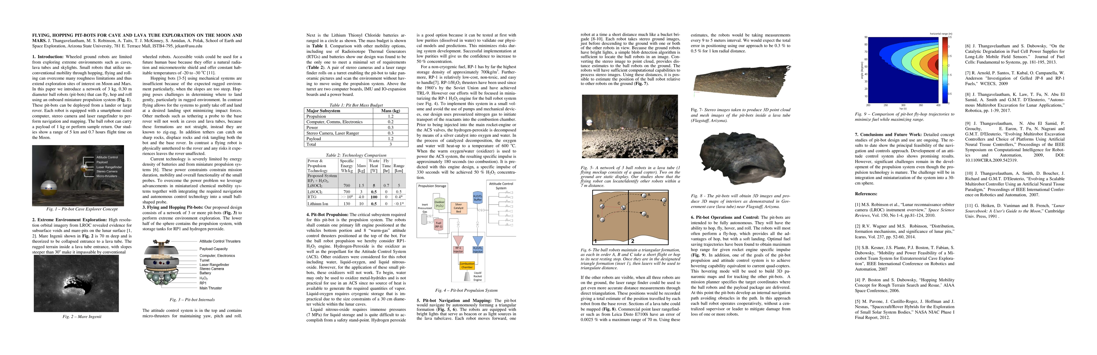 Researchers developed 3 kg ball robots called pit-bots that can fly, hop, and roll to explore extreme environments like caves on the Moon and Mars. These robots can carry a payload of 1 kg or perform sample return, offering a new mobility solution for lunar and Martian exploration.