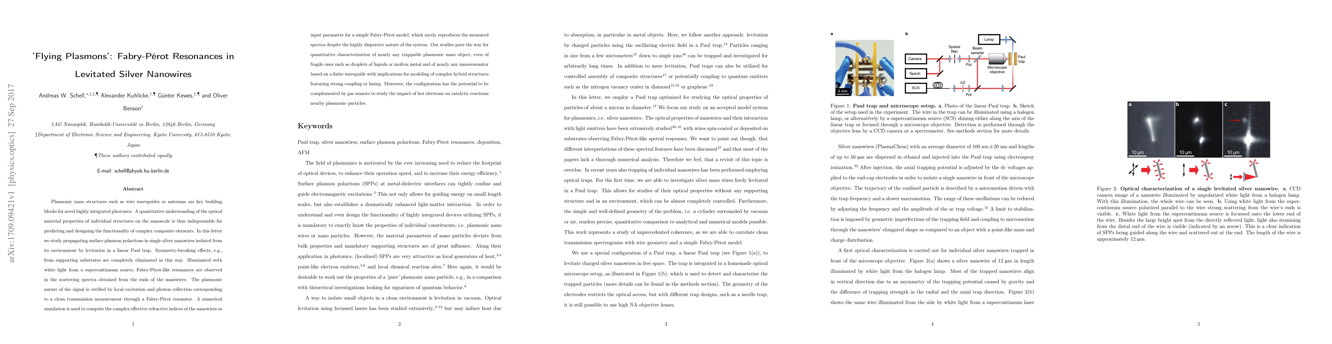 Plasmonic nano structures such as wire waveguides or antennas are key building blocks for novel highly integrated photonics. A quantitative understanding of the optical material properties of individual structures on the nanoscale is thus indispensable for predicting and designing the functionality of complex composite elements. In this letter we study propagating surface plasmon polaritons in single silver nanowires isolated from its environment by levitation in a linear Paul trap. Symmetry-breaking effects, e.g., from supporting substrates are completely eliminated in this way. Illuminated with white light from a supercontinuum source, Fabry-P\`erot-like resonances are observed in the scattering spectra obtained from the ends of the nanowires. The plasmonic nature of the signal is verified by local excitation and photon collection corresponding to a clean transmission measurement through a Fabry-P\`erot resonator. A numerical simulation is used to compute the complex effective refractive indices of the nanowires as input parameter for a simple Fabry-P\`erot model, which nicely reproduces the measured spectra despite the highly dispersive nature of the system. Our studies pave the way for quantitative characterization of nearly any trappable plasmonic nano object, even of fragile ones such as droplets of liquids or molten metal and of nearly any nanoresonator based on a finite waveguide with implications for modeling of complex hybrid structures featuring strong coupling or lasing. Moreover, the configuration has the potential to be complemented by gas sensors to study the impact of hot electrons on catalytic reactions nearby plasmonic particles.