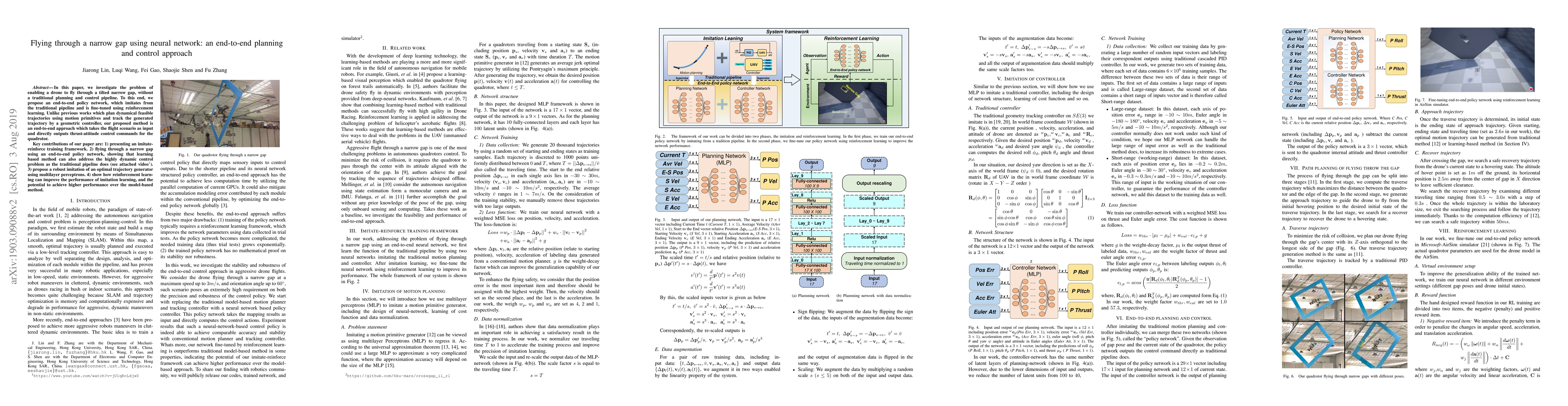 This paper proposes an end-to-end neural network approach for a drone to navigate through a tilted narrow gap without traditional planning and control methods. The key contributions include an imitate-reinforce training framework, demonstrating the effectiveness of reinforcement learning in enhancing the performance of imitation learning for dynamic control tasks.