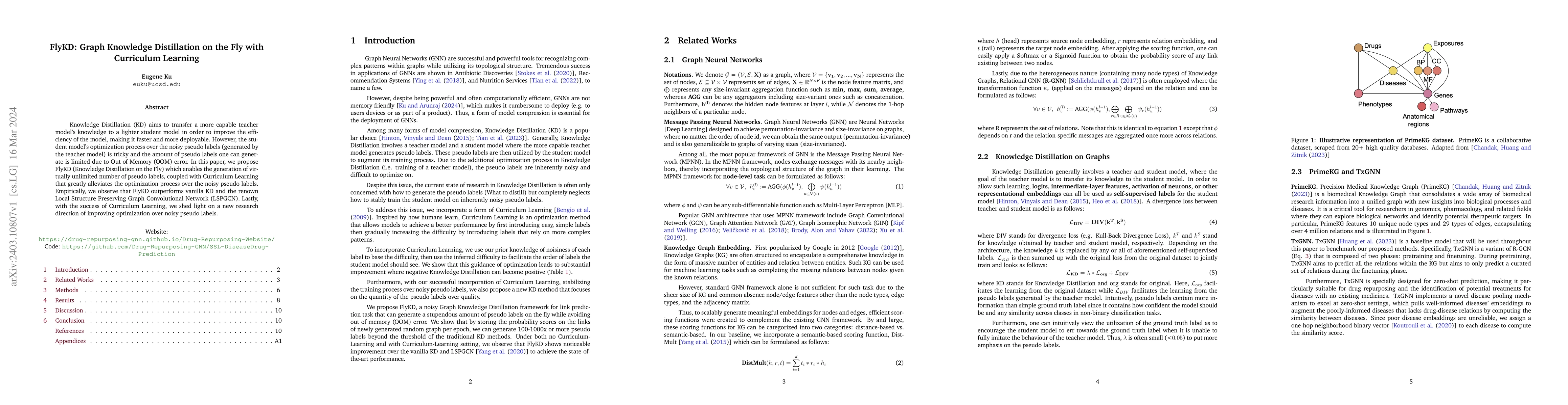Knowledge Distillation (KD) aims to transfer a more capable teacher model's knowledge to a lighter student model in order to improve the efficiency of the model, making it faster and more deployable. However, the student model's optimization process over the noisy pseudo labels (generated by the teacher model) is tricky and the amount of pseudo labels one can generate is limited due to Out of Memory (OOM) error. In this paper, we propose FlyKD (Knowledge Distillation on the Fly) which enables the generation of virtually unlimited number of pseudo labels, coupled with Curriculum Learning that greatly alleviates the optimization process over the noisy pseudo labels. Empirically, we observe that FlyKD outperforms vanilla KD and the renown Local Structure Preserving Graph Convolutional Network (LSPGCN). Lastly, with the success of Curriculum Learning, we shed light on a new research direction of improving optimization over noisy pseudo labels.