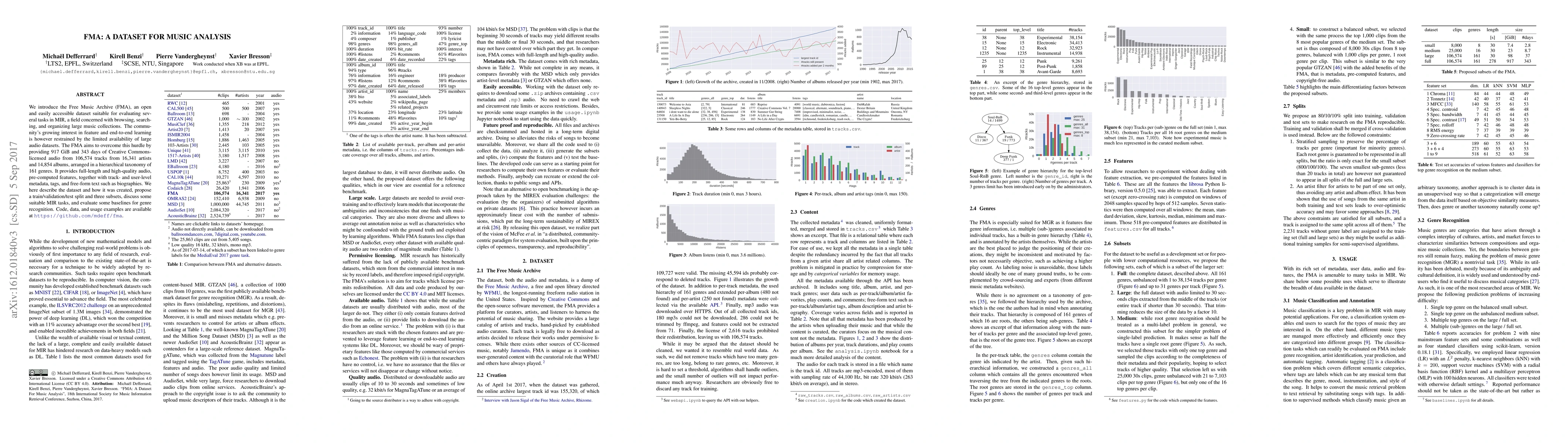 We introduce the Free Music Archive (FMA), an open and easily accessible dataset suitable for evaluating several tasks in MIR, a field concerned with browsing, searching, and organizing large music collections. The community's growing interest in feature and end-to-end learning is however restrained by the limited availability of large audio datasets. The FMA aims to overcome this hurdle by providing 917 GiB and 343 days of Creative Commons-licensed audio from 106,574 tracks from 16,341 artists and 14,854 albums, arranged in a hierarchical taxonomy of 161 genres. It provides full-length and high-quality audio, pre-computed features, together with track- and user-level metadata, tags, and free-form text such as biographies. We here describe the dataset and how it was created, propose a train/validation/test split and three subsets, discuss some suitable MIR tasks, and evaluate some baselines for genre recognition. Code, data, and usage examples are available at https://github.com/mdeff/fma