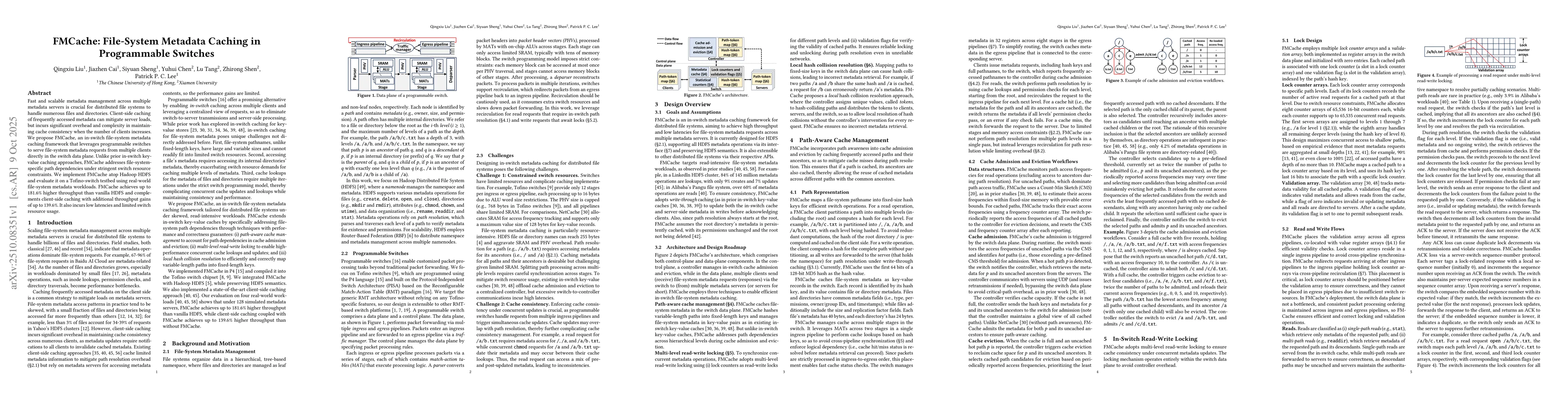 FMCache introduces a novel in-switch metadata caching framework with path-aware management, multi-level locking, and local hash collision resolution, enhancing performance and scalability in distributed file systems.