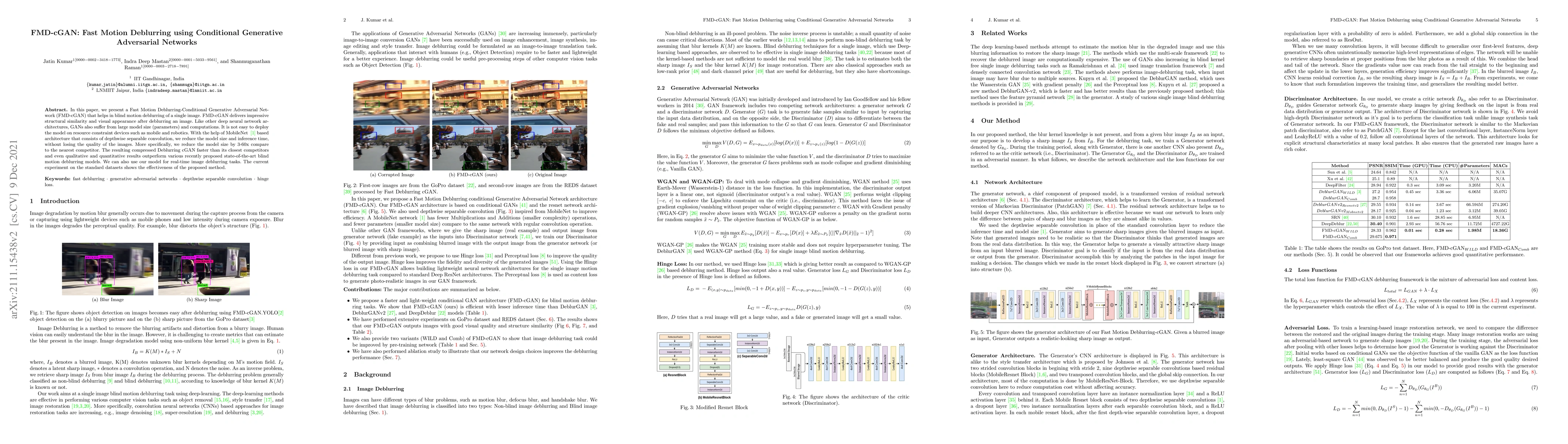 The paper introduces FMD-cGAN, a fast motion deblurring model for single images using a MobileNet-based architecture, achieving significant reductions in model size and inference time while maintaining high-quality deblurring performance. The method outperforms state-of-the-art models in both qualitative and quantitative metrics.