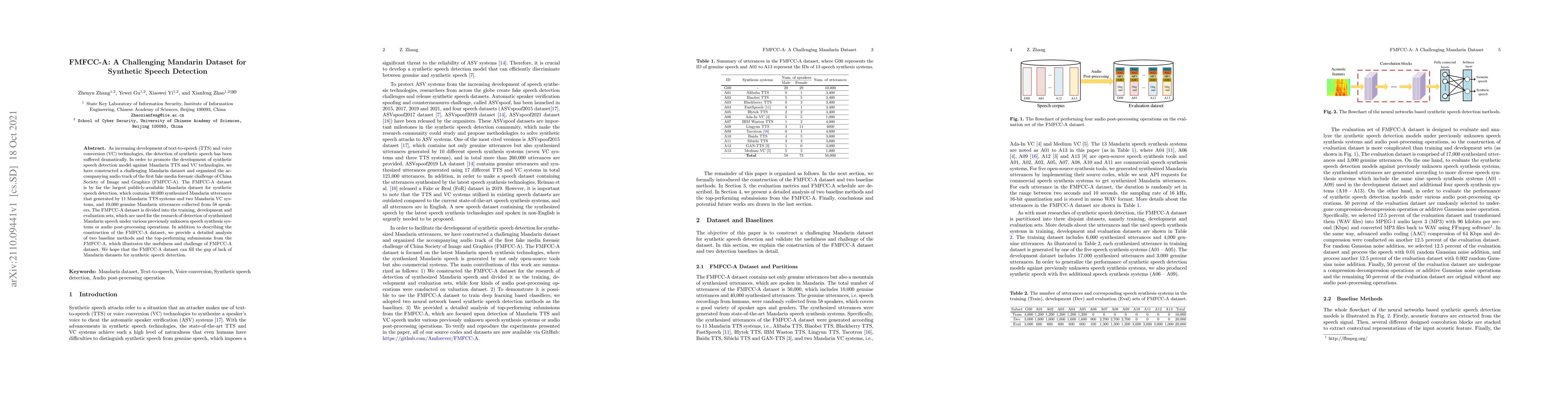 The FMFCC-A dataset is a large Mandarin synthetic speech detection resource, containing 40,000 synthesized and 10,000 genuine utterances, aimed at advancing detection models against Mandarin TTS and VC technologies. The dataset's comprehensive analysis of baseline methods and top submissions highlights its effectiveness and challenges in synthetic speech detection.