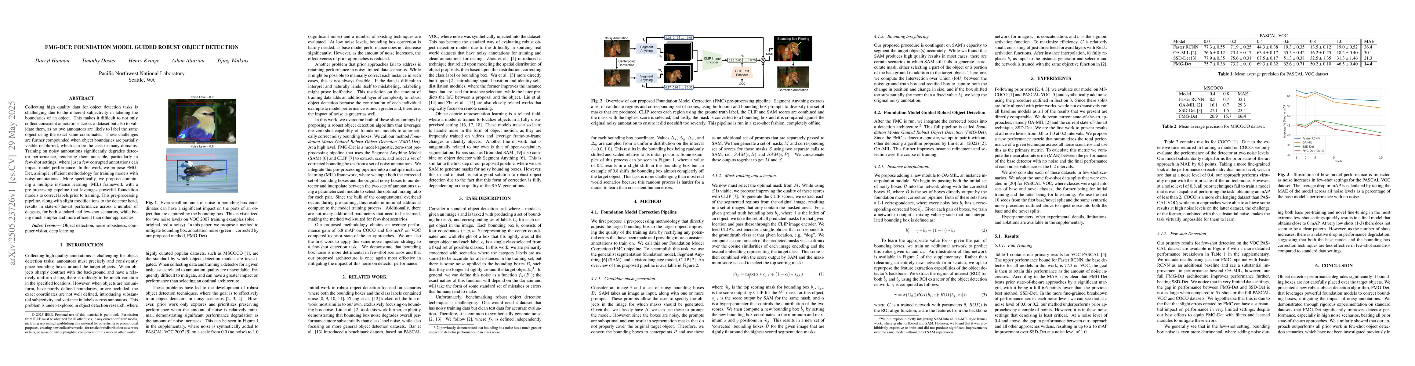 This research is important as it addresses the challenge of noisy annotations in object detection tasks, which is crucial for downstream tasks with limited, potentially noisy training datasets. The proposed FMG-Det method ensures robust object detection performance, making it valuable for real-world applications.