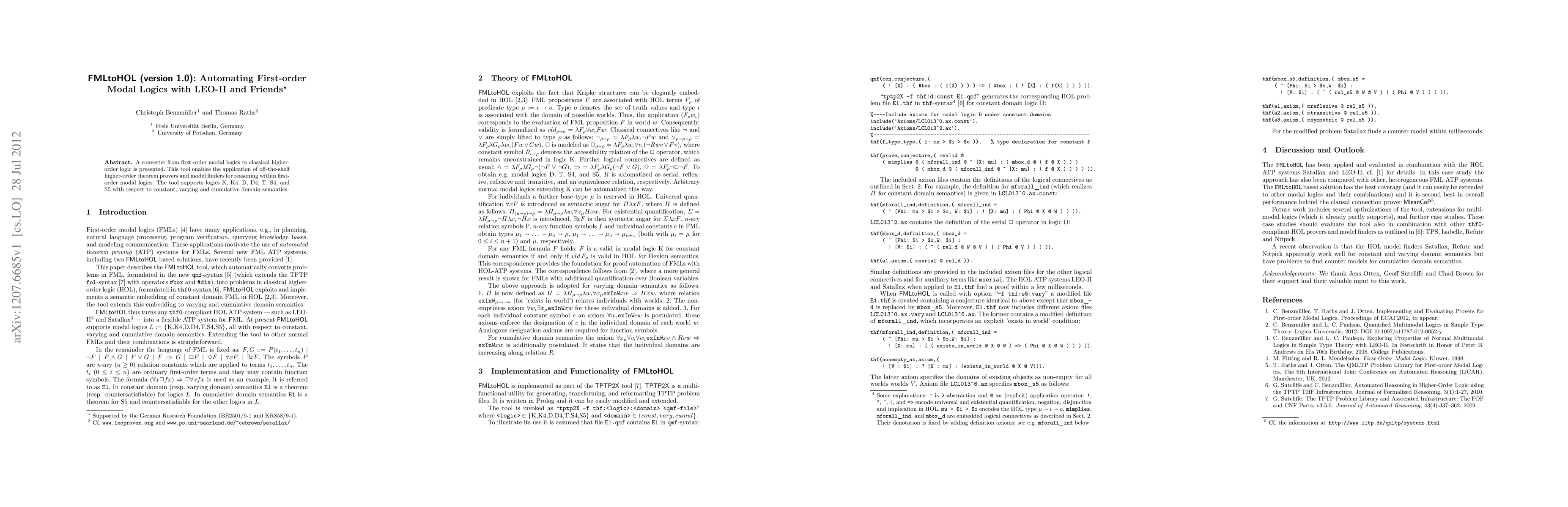 Summary: FMLtoHOL (version 1.0) automates the conversion of first-order modal logics to classical higher-order logic, facilitating the use of existing higher-order theorem provers for reasoning within various modal logics, including K, K4, D, D4, T, S4, and S5 under different domain semantics.