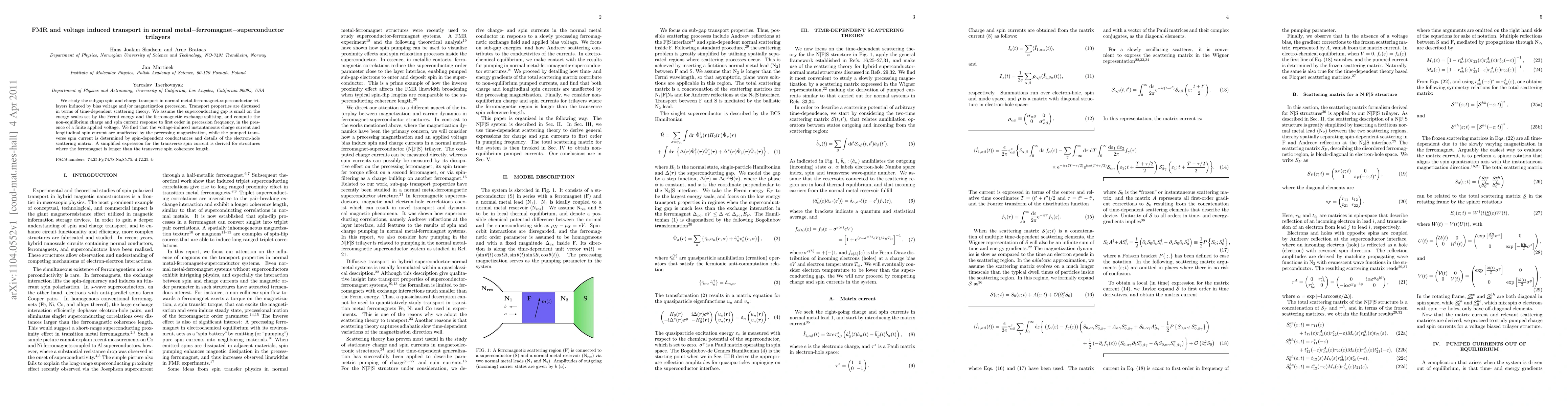 This paper investigates spin and charge transport in normal metal-ferromagnet-superconductor trilayers under bias voltage and magnetization precession, finding that voltage-induced charge and longitudinal spin currents remain unaffected by magnetization precession, while transverse spin currents depend on spin-dependent conductances and electron-hole scattering details. A simplified model for transverse spin current is derived for long ferromagnets.