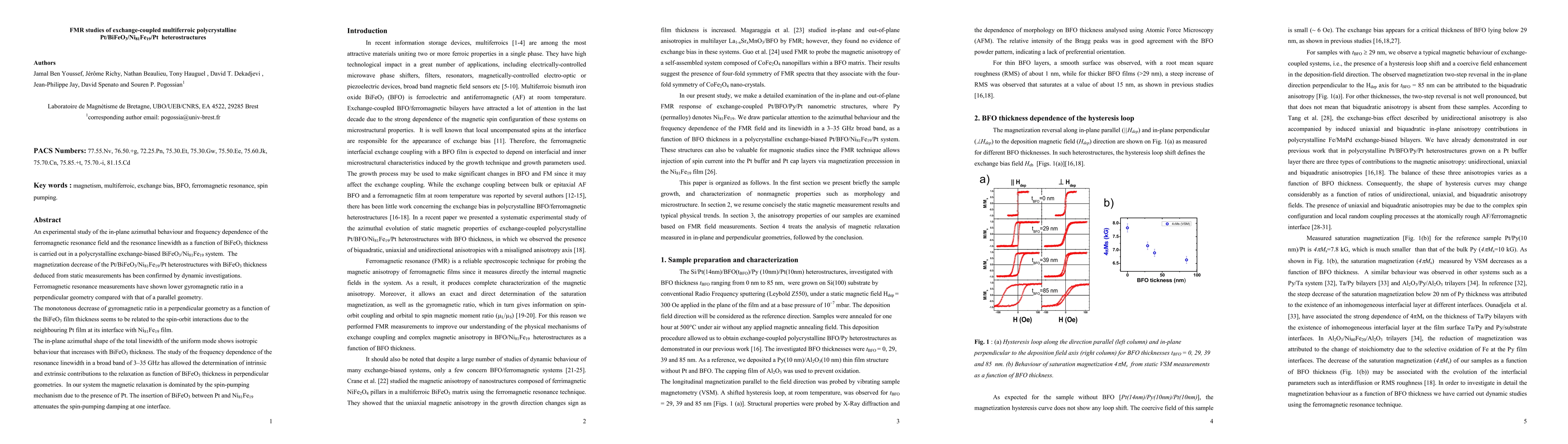 An experimental study of the in-plane azimuthal behaviour and frequency dependence of the ferromagnetic resonance field and the resonance linewidth as a function of BiFeO$_3$ thickness is carried out in a polycrystalline exchange-biased BiFeO$_3$/Ni$_{81}$Fe$_{19}$ system. The magnetization decrease of the Pt/BiFeO$_3$/Ni$_{81}$Fe$_{19}$/Pt heterostructures with BiFeO$_3$ thickness deduced from static measurements has been confirmed by dynamic investigations. Ferromagnetic resonance measurements have shown lower gyromagnetic ratio in a perpendicular geometry compared with that of a parallel geometry. The monotonous decrease of gyromagnetic ratio in a perpendicular geometry as a function of the BiFeO$_3$ film thickness seems to be related to the spin-orbit interactions due to the neighbouring Pt film at its interface with Ni$_{81}$Fe$_{19}$ film. The in-plane azimuthal shape of the total linewidth of the uniform mode shows isotropic behaviour that increases with BiFeO$_3$ thickness. The study of the frequency dependence of the resonance linewidth in a broad band of 3 to 35 GHz has allowed the determination of intrinsic and extrinsic contributions to the relaxation as function of BiFeO$_3$ thickness in perpendicular geometries. In our system the magnetic relaxation is dominated by the spin-pumping mechanism due to the presence of Pt. The insertion of BiFeO$_3$ between Pt and Ni$_{81}$Fe$_{19}$ attenuates the spin-pumping damping at one interface.