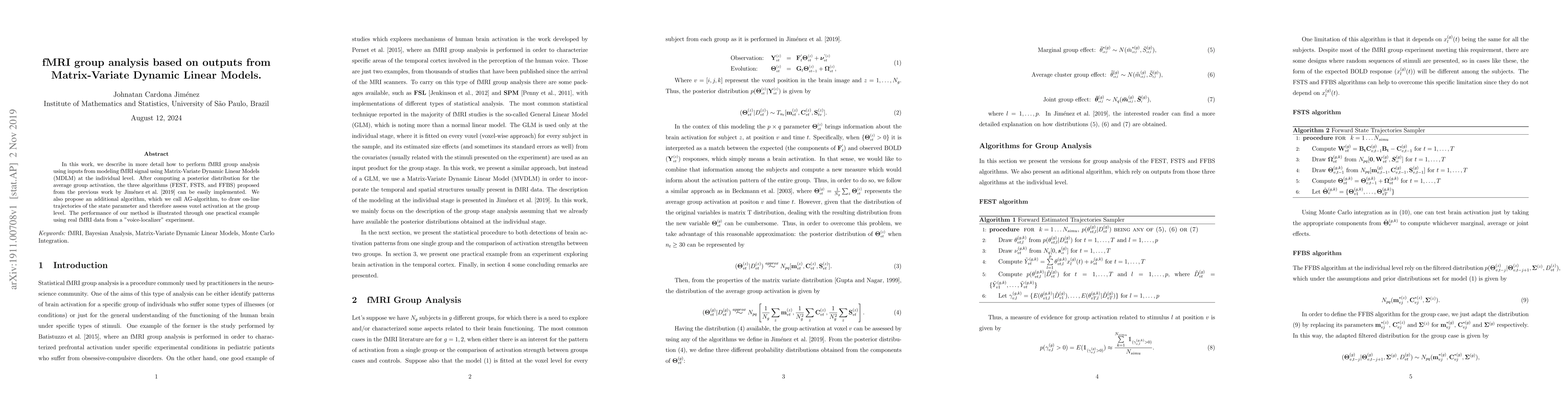 This paper details a method for fMRI group analysis using Matrix-Variate Dynamic Linear Models (MDLM) to model individual fMRI signals. It implements three algorithms (FEST, FSTS, FFBS) and introduces a new AG-algorithm to assess group-level voxel activation, demonstrated through an example using real fMRI data from a voice-localizer experiment.