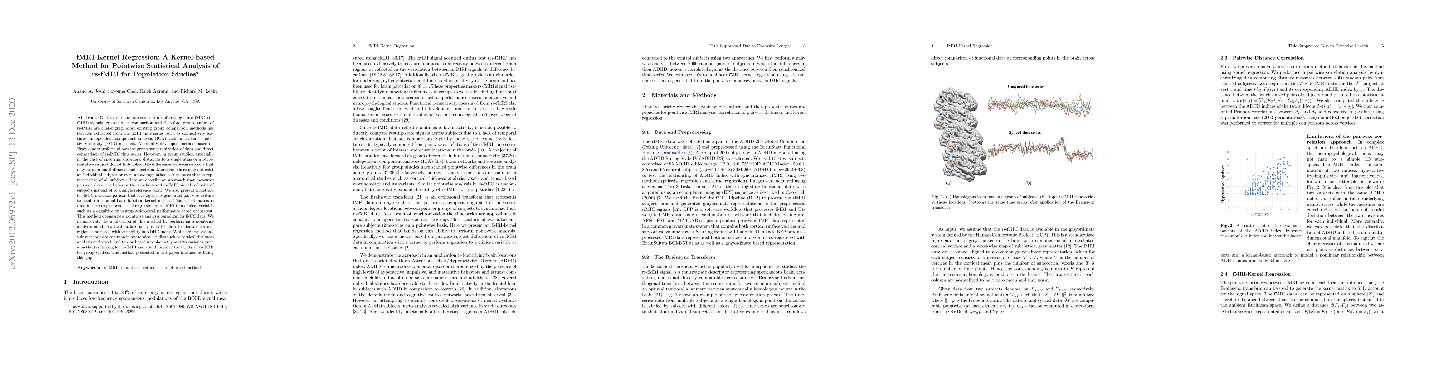 This paper introduces fMRI-Kernel Regression, a novel kernel-based method for pointwise statistical analysis of resting-state fMRI (rs-fMRI) in population studies. It measures pairwise distances between subjects' synchronized rs-fMRI signals and uses a radial basis function kernel matrix for regression to clinical variables, aiming to improve the utility of rs-fMRI for group studies, particularly in spectrum disorders.