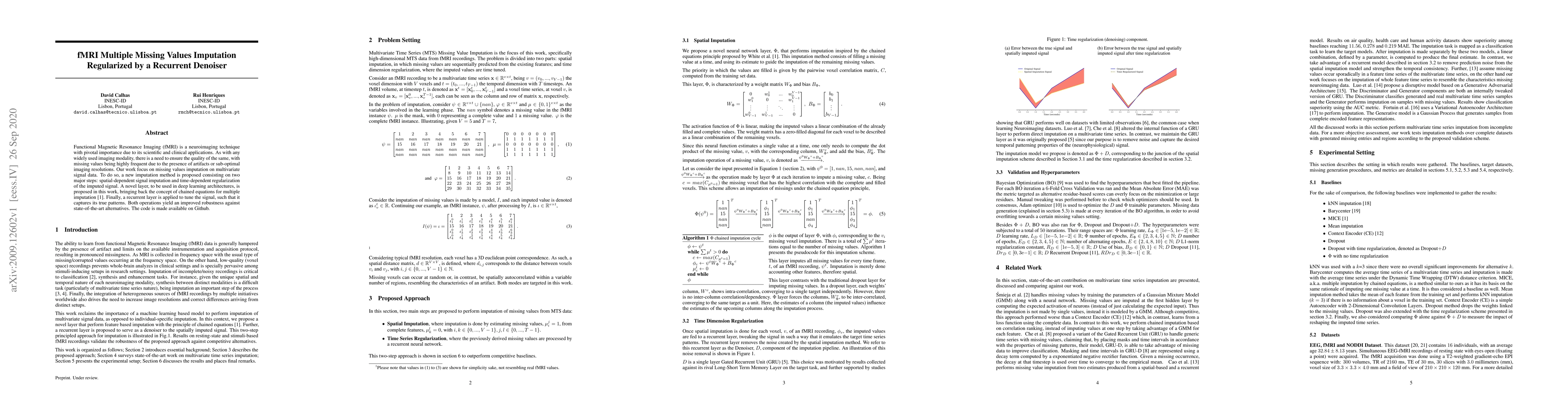 This paper proposes a novel method for imputing missing values in fMRI data, combining spatial-dependent imputation and time-dependent regularization using a recurrent denoiser. The method aims to improve data quality and robustness against artifacts, leveraging a new deep learning layer for enhanced performance.