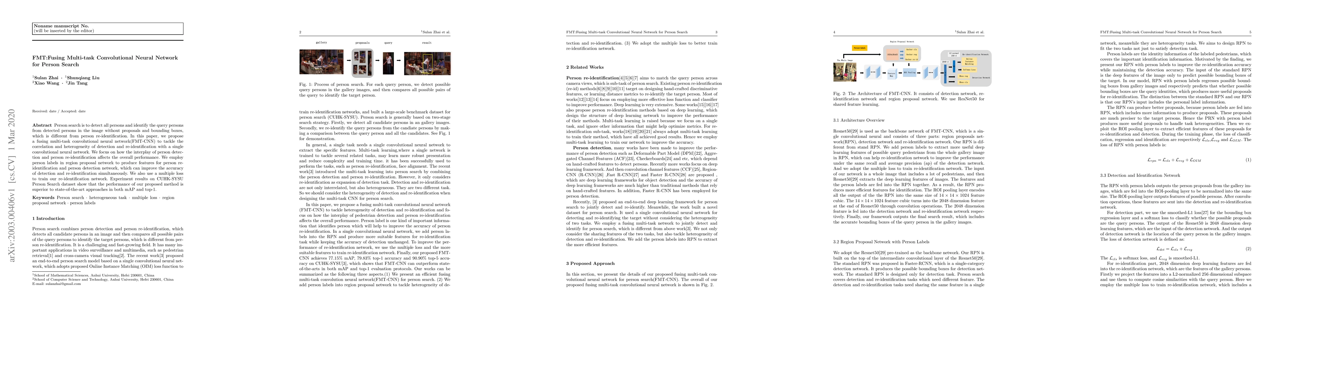 Person search is to detect all persons and identify the query persons from detected persons in the image without proposals and bounding boxes, which is different from person re-identification. In this paper, we propose a fusing multi-task convolutional neural network(FMT-CNN) to tackle the correlation and heterogeneity of detection and re-identification with a single convolutional neural network. We focus on how the interplay of person detection and person re-identification affects the overall performance. We employ person labels in region proposal network to produce features for person re-identification and person detection network, which can improve the accuracy of detection and re-identification simultaneously. We also use a multiple loss to train our re-identification network. Experiment results on CUHK-SYSU Person Search dataset show that the performance of our proposed method is superior to state-of-the-art approaches in both mAP and top-1.