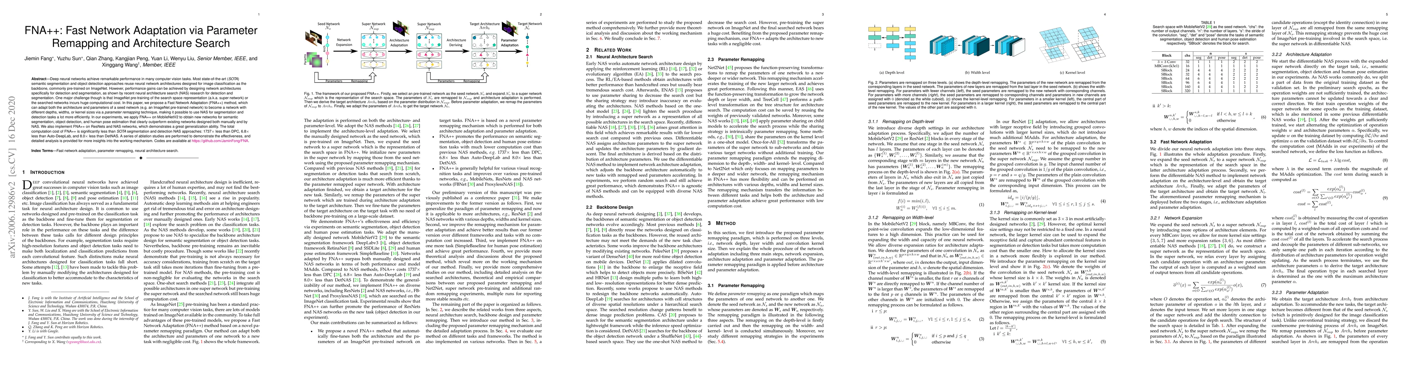 The paper proposes FNA++, a method for fast network adaptation that efficiently remaps parameters and searches for network architectures, significantly reducing the computational cost of neural architecture search (NAS) for segmentation and detection tasks. Experiments show FNA++ outperforms both manually designed and NAS-based networks, with a computational cost 1737x less than DPC, 6.8x less than Auto-DeepLab, and 8.0x less than DetNAS.