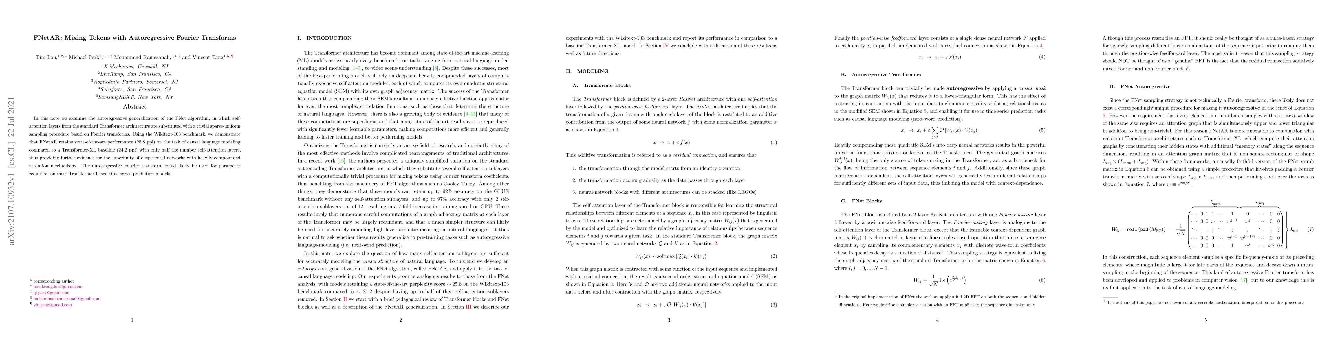 In this note we examine the autoregressive generalization of the FNet algorithm, in which self-attention layers from the standard Transformer architecture are substituted with a trivial sparse-uniformsampling procedure based on Fourier transforms. Using the Wikitext-103 benchmark, we demonstratethat FNetAR retains state-of-the-art performance (25.8 ppl) on the task of causal language modelingcompared to a Transformer-XL baseline (24.2 ppl) with only half the number self-attention layers,thus providing further evidence for the superfluity of deep neural networks with heavily compoundedattention mechanisms. The autoregressive Fourier transform could likely be used for parameterreduction on most Transformer-based time-series prediction models.