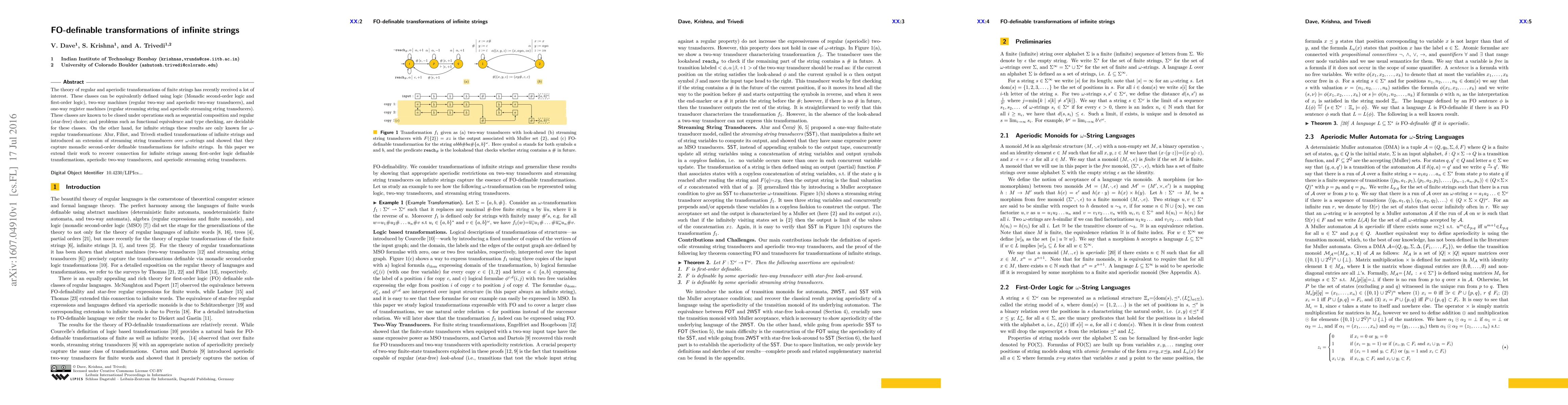 This paper extends the study of transformations of infinite strings by linking first-order logic definable transformations, aperiodic two-way transducers, and aperiodic streaming string transducers, building on prior work that focused on $\omega$-regular transformations.