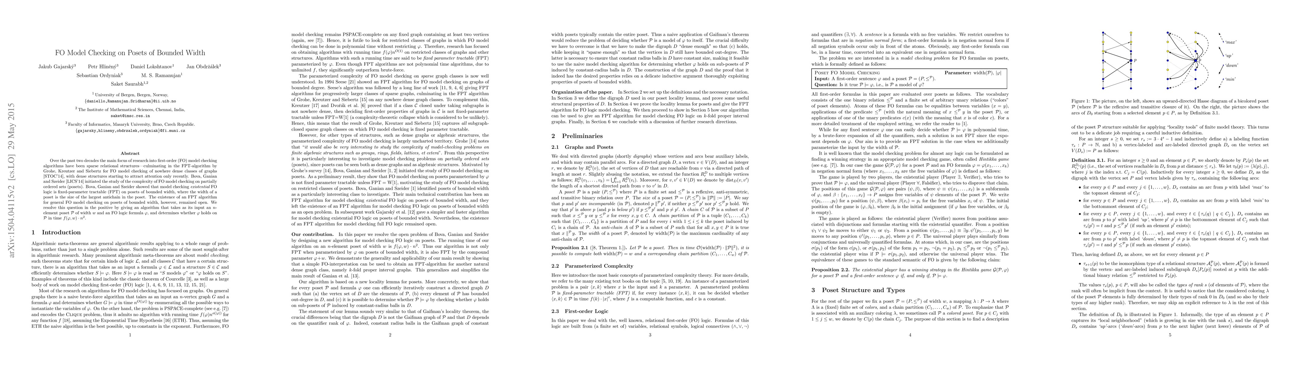 This paper presents an algorithm for first-order (FO) model checking on partially ordered sets (posets) of bounded width, confirming the fixed-parameter tractability (FPT) of general FO logic on such posets, resolving a long-standing open question. The algorithm runs in time $f(\phi,w)\cdot n^2$, where $\cal P$ is an $n$-element poset of width $w$ and $\phi$ is an FO logic formula.