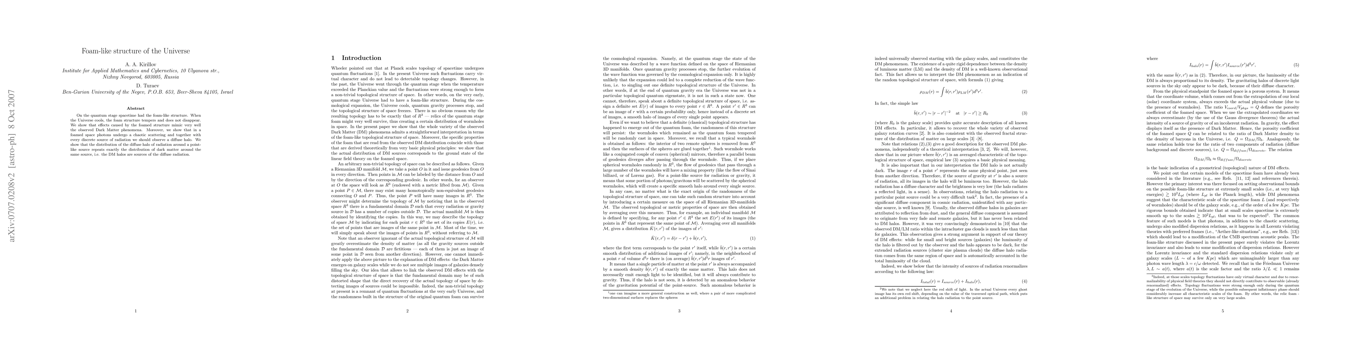 On the quantum stage spacetime had the foam-like structure. When the Universe cools, the foam structure tempers and does not disappear. We show that effects caused by the foamed structure mimic very well the observed Dark Matter phenomena. Moreover, we show that in a foamed space photons undergo a chaotic scattering and together with every discrete source of radiation we should observe a diffuse halo. We show that the distribution of the diffuse halo of radiation around a point-like source repeats exactly the distribution of dark matter around the same source, i.e. the DM halos are sources of the diffuse radiation.