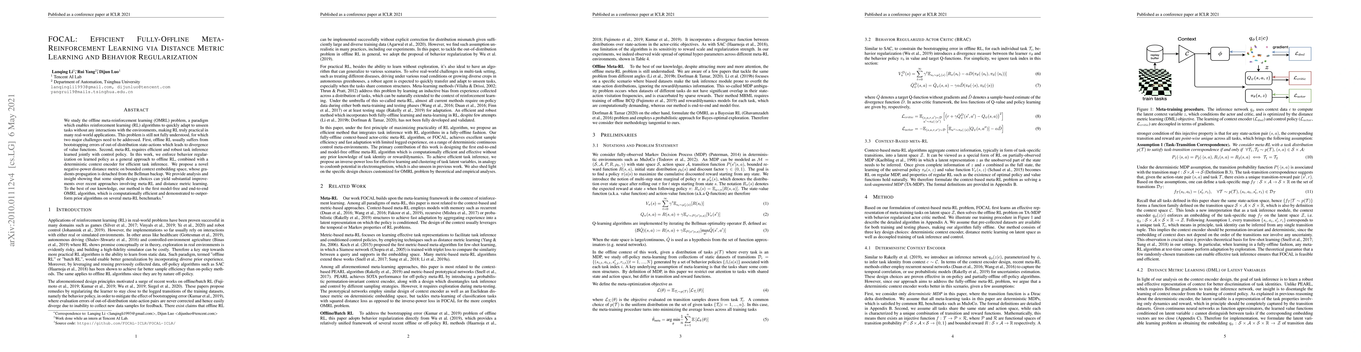 This paper proposes FOCAL, an efficient offline meta-reinforcement learning method addressing bootstrapping errors and task inference challenges through behavior regularization and a novel distance metric. It demonstrates superior performance over prior meta-RL algorithms on various benchmarks.