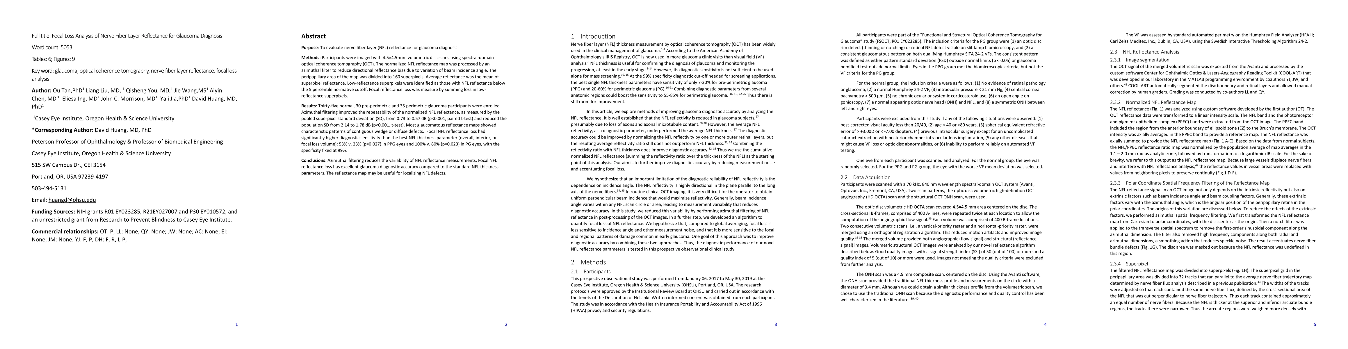 This study evaluates the use of nerve fiber layer (NFL) reflectance from OCT scans for glaucoma diagnosis, finding that azimuthal filtering improves measurement repeatability. Focal NFL reflectance loss shows higher diagnostic sensitivity than NFL thickness parameters, indicating its potential for improved glaucoma detection.