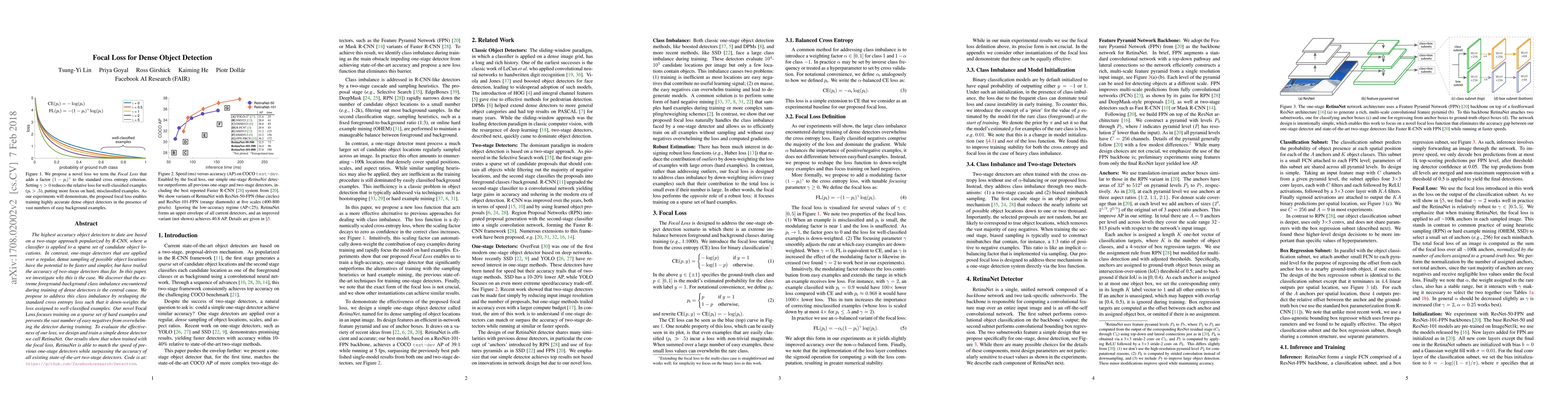 The highest accuracy object detectors to date are based on a two-stage approach popularized by R-CNN, where a classifier is applied to a sparse set of candidate object locations. In contrast, one-stage detectors that are applied over a regular, dense sampling of possible object locations have the potential to be faster and simpler, but have trailed the accuracy of two-stage detectors thus far. In this paper, we investigate why this is the case. We discover that the extreme foreground-background class imbalance encountered during training of dense detectors is the central cause. We propose to address this class imbalance by reshaping the standard cross entropy loss such that it down-weights the loss assigned to well-classified examples. Our novel Focal Loss focuses training on a sparse set of hard examples and prevents the vast number of easy negatives from overwhelming the detector during training. To evaluate the effectiveness of our loss, we design and train a simple dense detector we call RetinaNet. Our results show that when trained with the focal loss, RetinaNet is able to match the speed of previous one-stage detectors while surpassing the accuracy of all existing state-of-the-art two-stage detectors. Code is at: https://github.com/facebookresearch/Detectron.