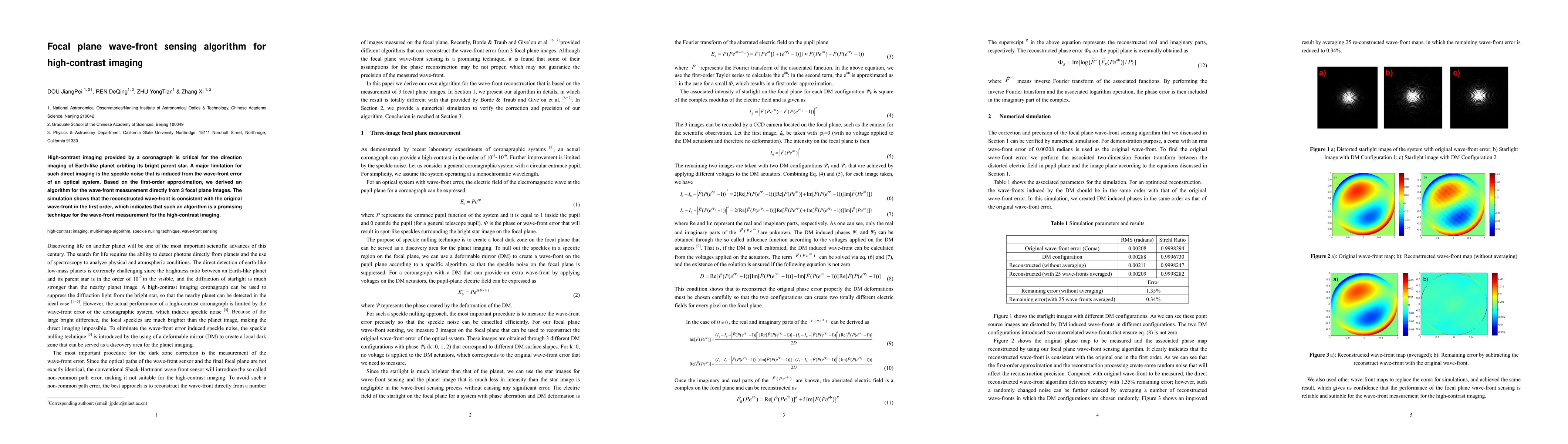 The paper presents a focal plane wave-front sensing algorithm that leverages three images from a deformable mirror to correct optical system errors, enabling high-contrast imaging of Earth-like planets. The algorithm includes amplitude modulation to achieve an uncorrelated wave-front, demonstrating effective wave-front measurement through simulations.