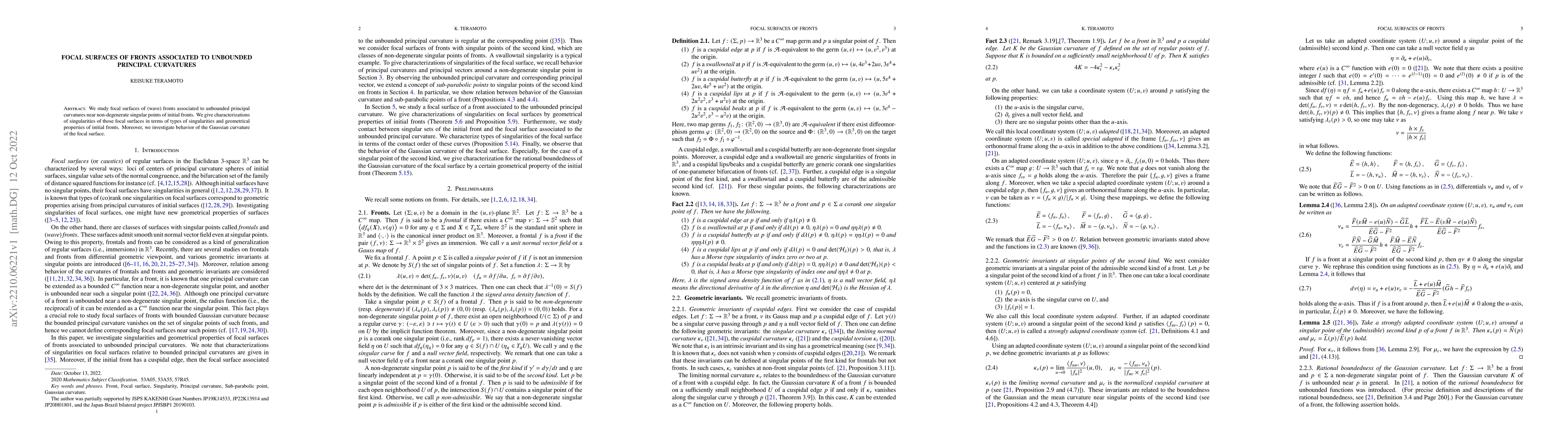This paper characterizes focal surfaces of wave fronts with unbounded principal curvatures near singular points, detailing their singularities and geometrical properties, and examines the behavior of the Gaussian curvature of these focal surfaces.