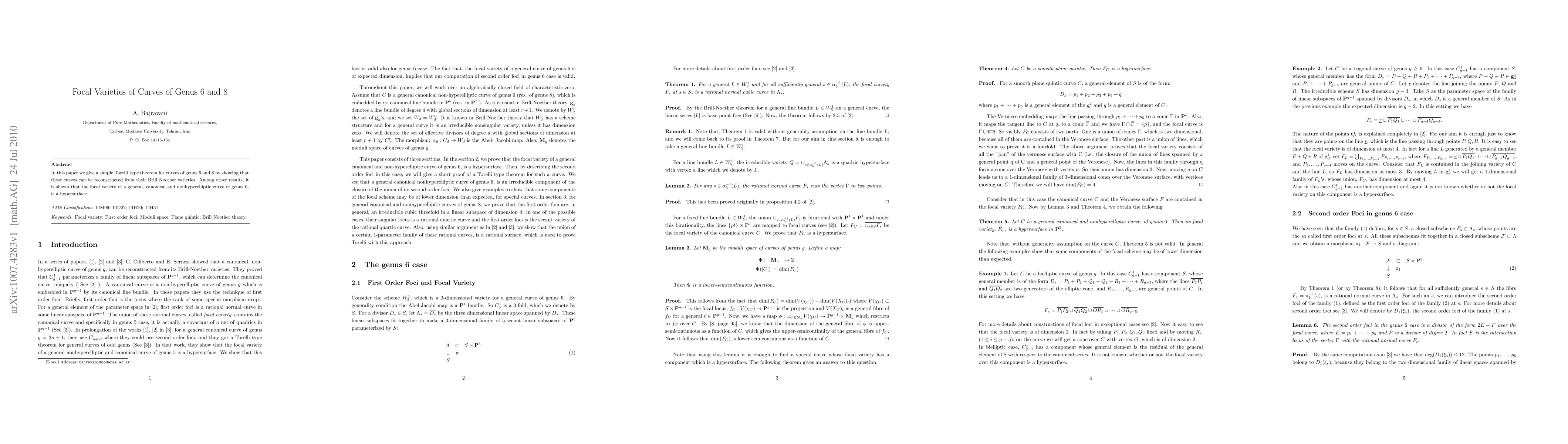 This paper establishes a Torelli type theorem for curves of genus 6 and 8, demonstrating that these curves can be reconstructed from their Brill-Noether varieties. Specifically, it shows that the focal variety of a general, canonical, and nonhyperelliptic curve of genus 6 is a hypersurface.