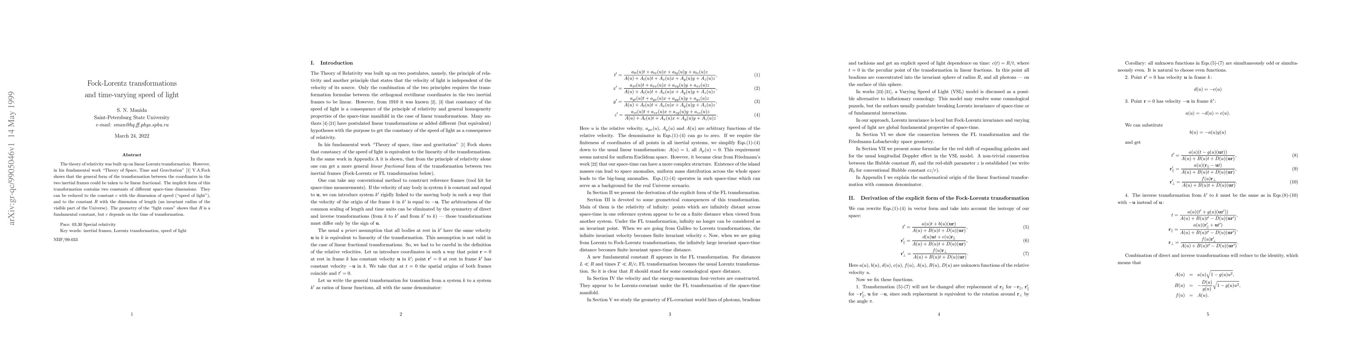 The theory of relativity was built up on linear Lorentz transformation. However, in his fundamental work "Theory of Space, Time and Gravitation" V.A.Fock shows that the general form of the transformation between the coordinates in the two inertial frames could be taken to be linear fractional. The implicit form of this transformation contains two constants of different space-time dimensions. They can be reduced to the constant "c" with the dimension of speed ("speed of light"), and to the constant "R" with the dimension of length (an invariant radius of the visible part of the Universe). The geometry of the "light cones" shows that "R" is a fundamental constant, but "c" depends on the time of transformation.