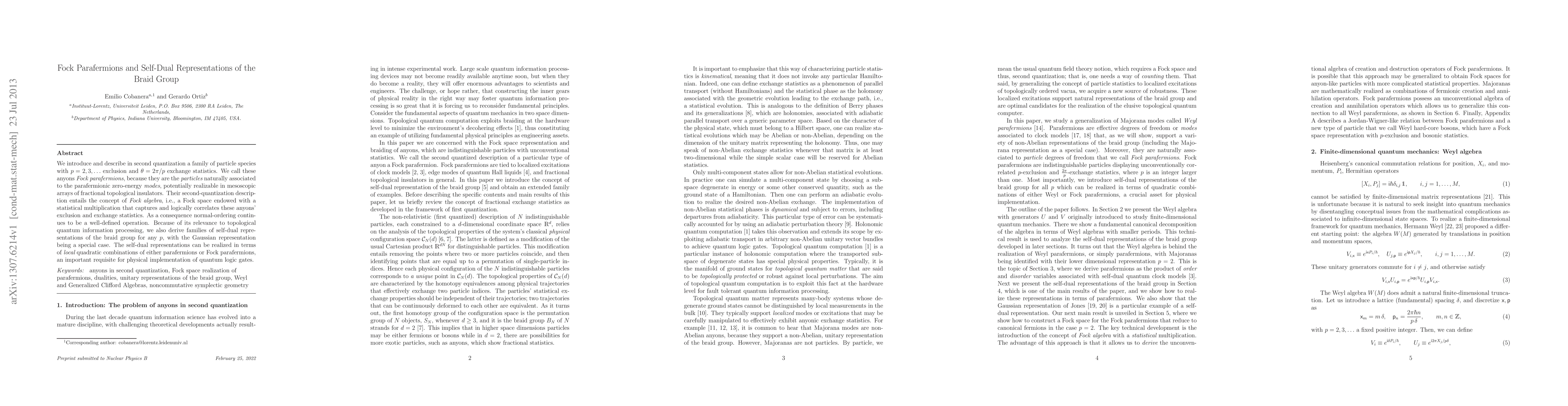 This paper introduces Fock parafermions, anyons with \(p\)-exclusion and \(\theta=2\pi/p\) exchange statistics, and describes their second-quantization framework. It also derives self-dual representations of the braid group, crucial for topological quantum information processing, and discusses their physical implementation in quantum logic gates.