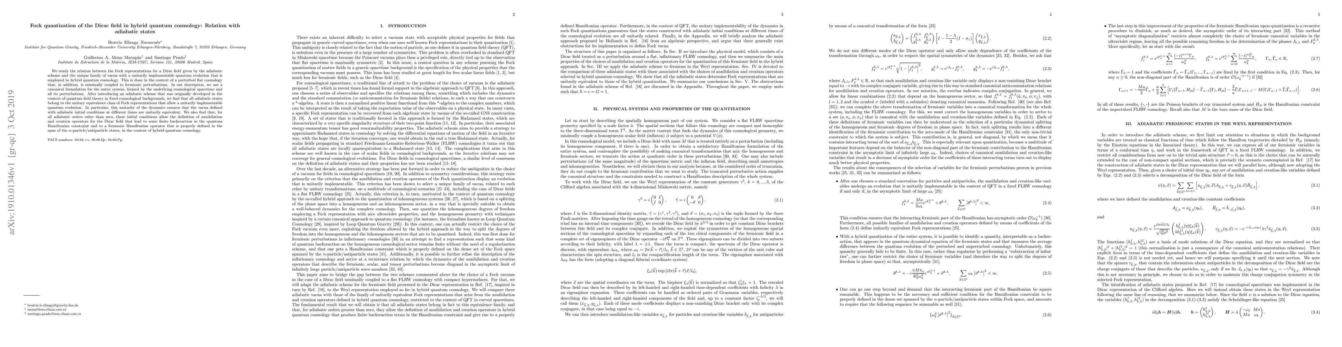 We study the relation between the Fock representations for a Dirac field given by the adiabatic scheme and the unique family of vacua with a unitarily implementable quantum evolution that is employed in hybrid quantum cosmology. This is done in the context of a perturbed flat cosmology that, in addition, is minimally coupled to fermionic perturbations. In our description, we use a canonical formulation for the entire system, formed by the underlying cosmological spacetime and all its perturbations. After introducing an adiabatic scheme that was originally developed in the context of quantum field theory in fixed cosmological backgrounds, we find that all adiabatic states belong to the unitary equivalence class of Fock representations that allow a unitarily implementable quantum evolution. In particular, this unitarity of the dynamics ensures that the vacua defined with adiabatic initial conditions at different times are unitarily equivalent. We also find that, for all adiabatic orders other than zero, these initial conditions allow the definition of annihilation and creation operators for the Dirac field that lead to some finite backreaction in the quantum Hamiltonian constraint and to a fermionic Hamiltonian operator that is properly defined in the span of the \textit{n}-particle/antiparticle states, in the context of hybrid quantum cosmology.