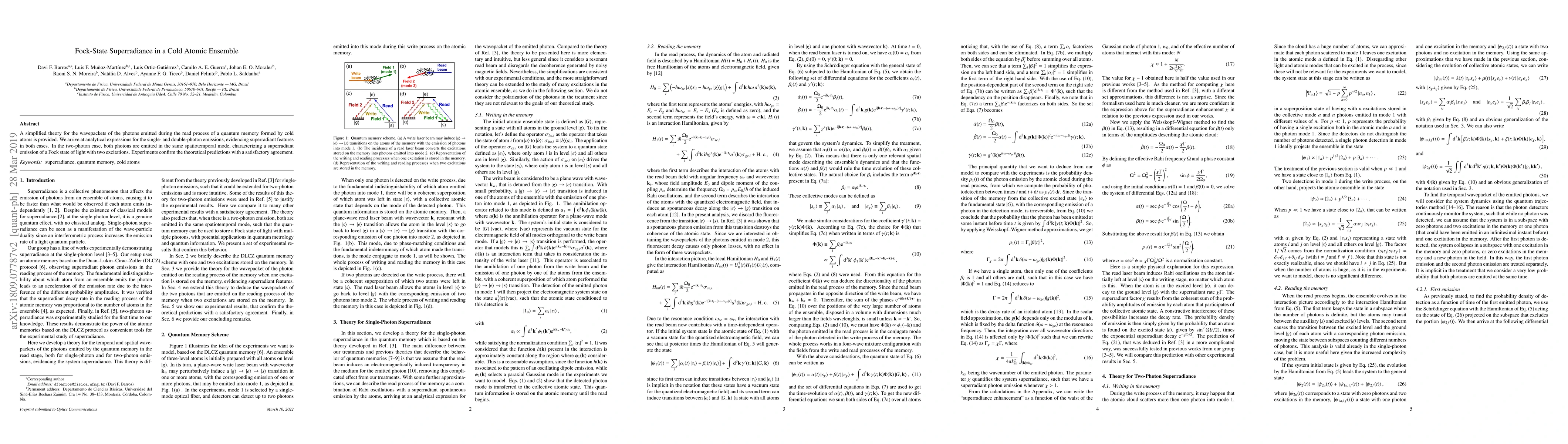 A simplified theory for the wavepackets of the photons emitted during the read process of a quantum memory formed by cold atoms is provided. We arrive at analytical expressions for the single- and double-photon emissions, evidencing superradiant features in both cases. In the two-photon case, both photons are emitted in the same spatiotemporal mode, characterizing a superradiant emission of a Fock state of light with two excitations. Experiments confirm the theoretical predictions with a satisfactory agreement.