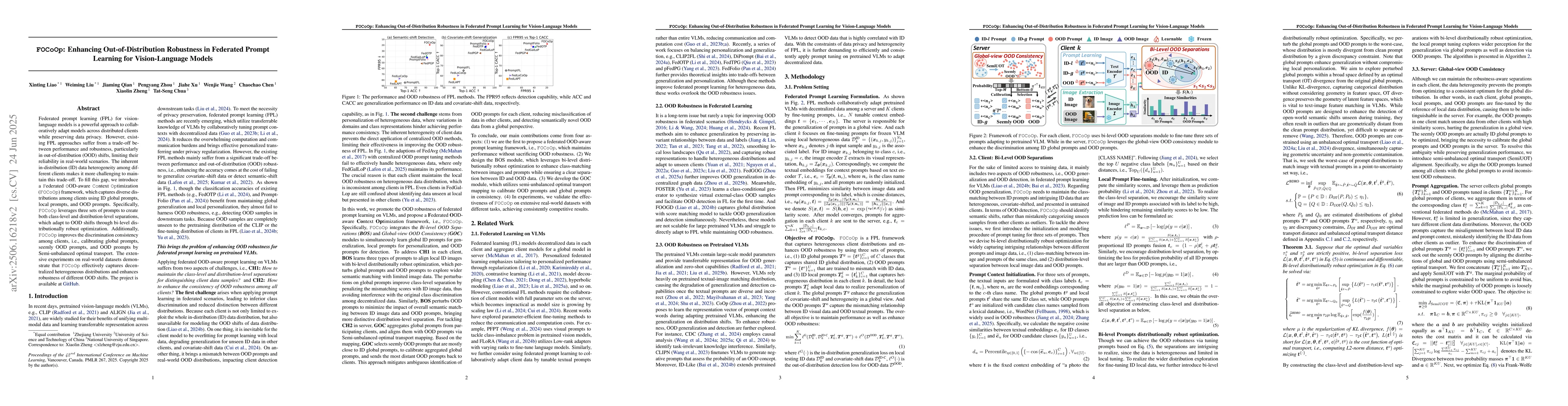 Federated prompt learning (FPL) for vision-language models is a powerful approach to collaboratively adapt models across distributed clients while preserving data privacy. However, existing FPL approaches suffer from a trade-off between performance and robustness, particularly in out-of-distribution (OOD) shifts, limiting their reliability in real-world scenarios. The inherent in-distribution (ID) data heterogeneity among different clients makes it more challenging to maintain this trade-off. To fill this gap, we introduce a Federated OOD-aware Context Optimization (FOCoOp) framework, which captures diverse distributions among clients using ID global prompts, local prompts, and OOD prompts. Specifically, FOCoOp leverages three sets of prompts to create both class-level and distribution-level separations, which adapt to OOD shifts through bi-level distributionally robust optimization. Additionally, FOCoOp improves the discrimination consistency among clients, i.e., calibrating global prompts, seemingly OOD prompts, and OOD prompts by semi-unbalanced optimal transport. The extensive experiments on real-world datasets demonstrate that FOCoOp effectively captures decentralized heterogeneous distributions and enhances robustness of different OOD shifts. The project is available at GitHub.