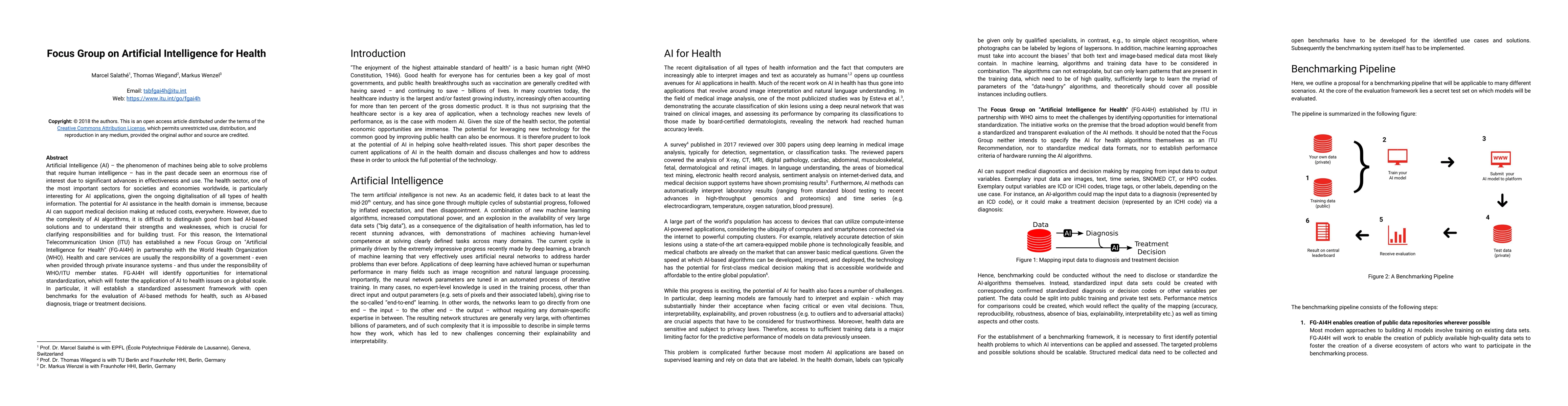 Artificial Intelligence (AI) - the phenomenon of machines being able to solve problems that require human intelligence - has in the past decade seen an enormous rise of interest due to significant advances in effectiveness and use. The health sector, one of the most important sectors for societies and economies worldwide, is particularly interesting for AI applications, given the ongoing digitalisation of all types of health information. The potential for AI assistance in the health domain is immense, because AI can support medical decision making at reduced costs, everywhere. However, due to the complexity of AI algorithms, it is difficult to distinguish good from bad AI-based solutions and to understand their strengths and weaknesses, which is crucial for clarifying responsibilities and for building trust. For this reason, the International Telecommunication Union (ITU) has established a new Focus Group on "Artificial Intelligence for Health" (FG-AI4H) in partnership with the World Health Organization (WHO). Health and care services are usually the responsibility of a government - even when provided through private insurance systems - and thus under the responsibility of WHO/ITU member states. FG-AI4H will identify opportunities for international standardization, which will foster the application of AI to health issues on a global scale. In particular, it will establish a standardized assessment framework with open benchmarks for the evaluation of AI-based methods for health, such as AI-based diagnosis, triage or treatment decisions.