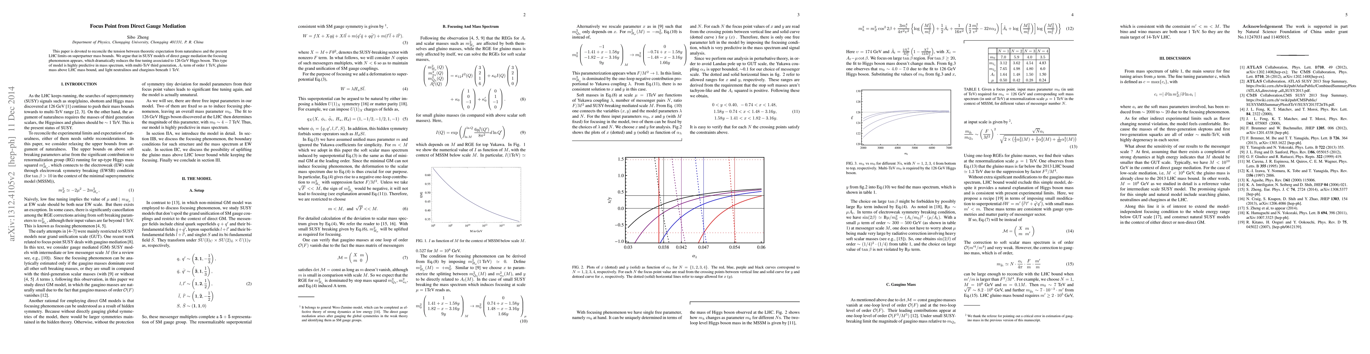 This paper explores direct gauge mediation in SUSY models to reconcile naturalness expectations with LHC superpartner mass limits, demonstrating a focusing phenomenon that reduces fine-tuning for the 126 GeV Higgs, predicting a multi-TeV third generation, and light neutralinos and charginos below 1 TeV.