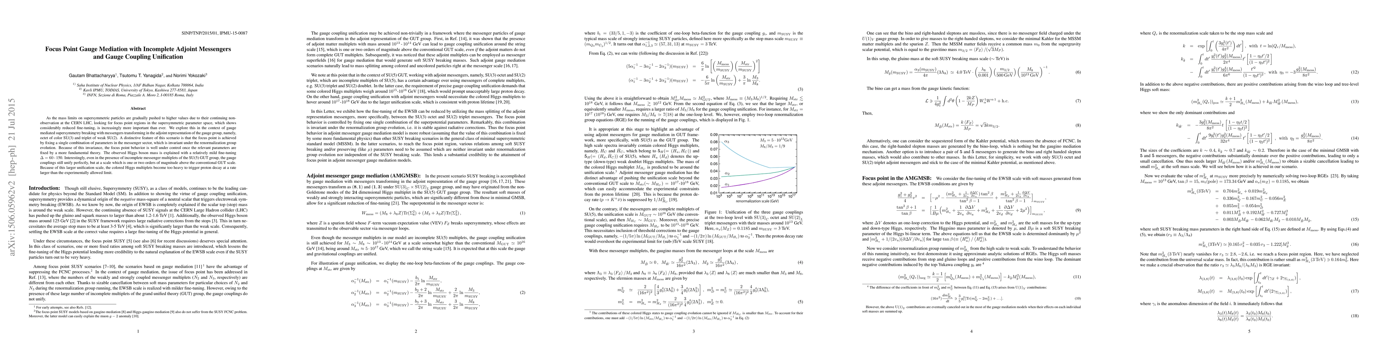 This paper investigates focus point gauge mediation in supersymmetry with adjoint messengers, demonstrating reduced fine-tuning and perfect gauge coupling unification at a higher scale, thus avoiding proton decay while explaining the observed Higgs boson mass.