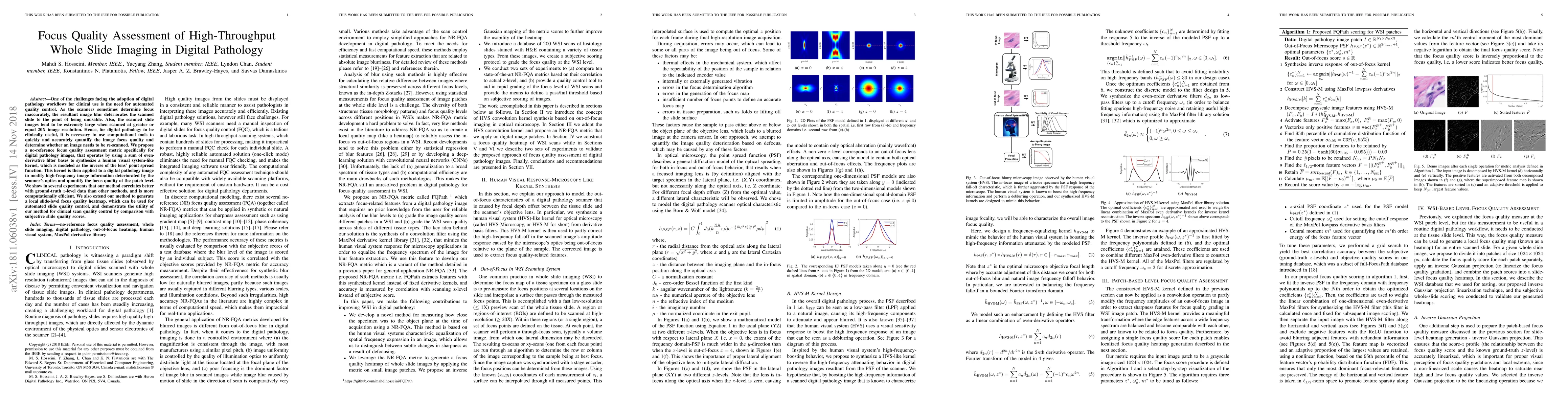 This paper proposes a no-reference focus quality assessment metric for high-throughput whole slide imaging in digital pathology, utilizing a sum of even-derivative filter bases to mimic human visual perception. The method correlates better with ground-truth data and is more efficient than existing techniques, generating a local focus quality heatmap for automated quality control.