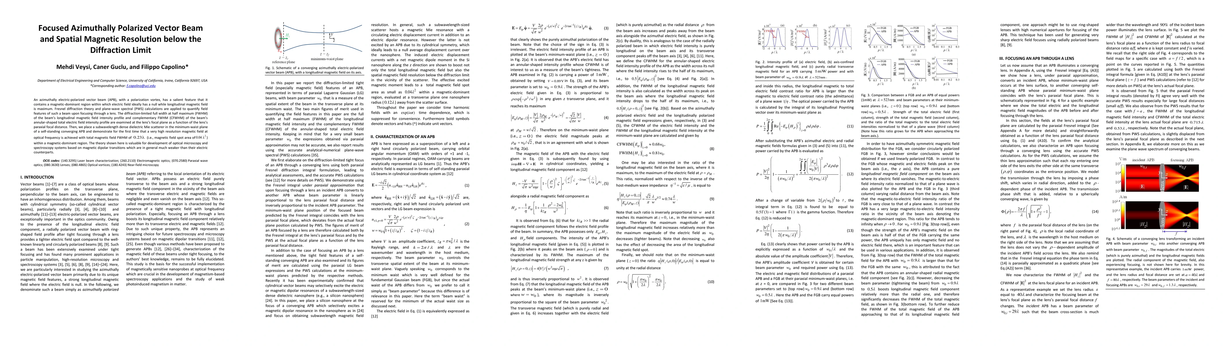 An azimuthally electric-polarized vector beam (APB), with a polarization vortex, has a salient feature that it contains a magnetic-dominant region within which electric field ideally has a null while longitudinal magnetic field is maximum. Fresnel diffraction theory and plane-wave spectral (PWS) calculations are applied to quantify field features of such a beam upon focusing through a lens. The diffraction-limited full width at half maximum (FWHM) of the beam's longitudinal magnetic field intensity profile and complementary FWHM (CFWHM) of the beam's annular-shaped total electric field intensity profile are examined at the lens's focal plane as a function of the lens's paraxial focal distance. Then, we place a subwavelength dense dielectric Mie scatterer in the minimum-waist plane of a self-standing converging APB and demonstrate for the first time that a very high resolution magnetic field at optical frequency is achieved with total magnetic field FWHM of 0.23{\lambda} (i.e., magnetic field spot area of 0.04{\lambda}^2) within a magnetic-dominant region. The theory shown here is valuable for development of optical microscopy and spectroscopy systems based on magnetic dipolar transitions which are in general much weaker than their electric counterparts.