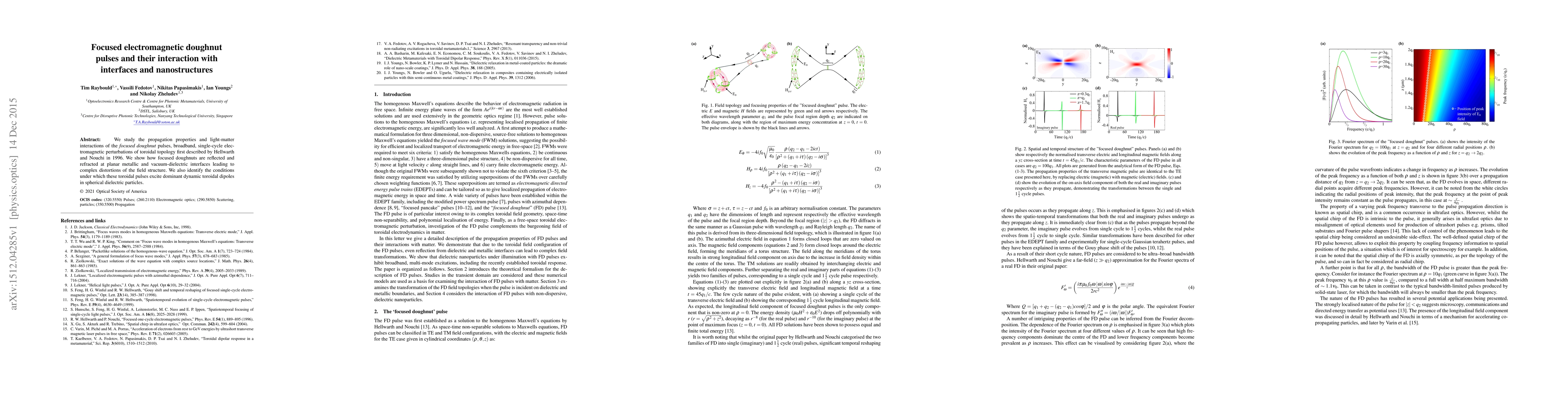 Researchers studied electromagnetic doughnut pulses and their interactions with interfaces and nanostructures, finding that they can distort field structures and excite dynamic toroidal dipoles in spherical particles.