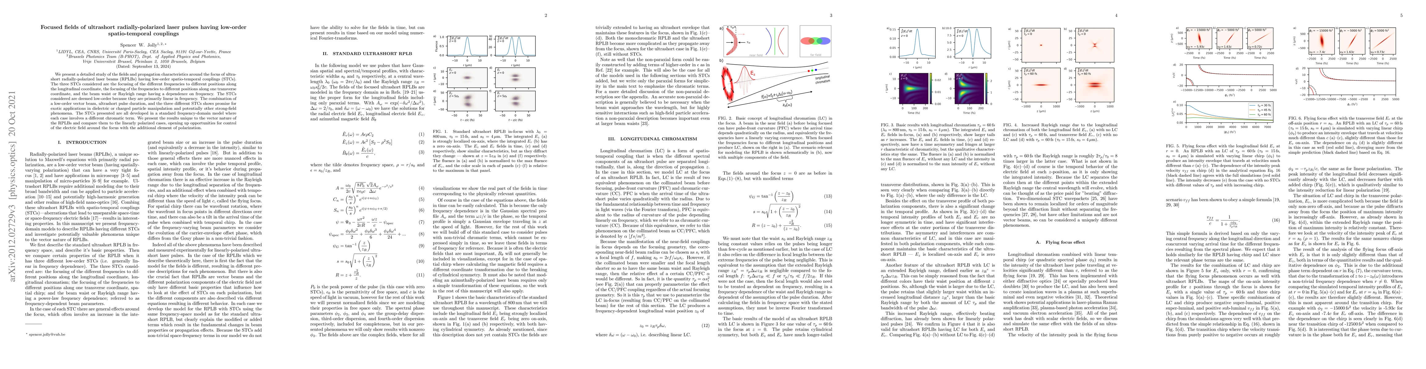 The study presents a detailed analysis of the fields and propagation characteristics of ultrashort radially-polarized laser beams (RPLBs) with low-order spatio-temporal couplings (STCs), focusing on three specific STCs: different frequencies focusing to different longitudinal positions, focusing to different transverse positions, and beam waist or Rayleigh range having a power-law frequency dependence.